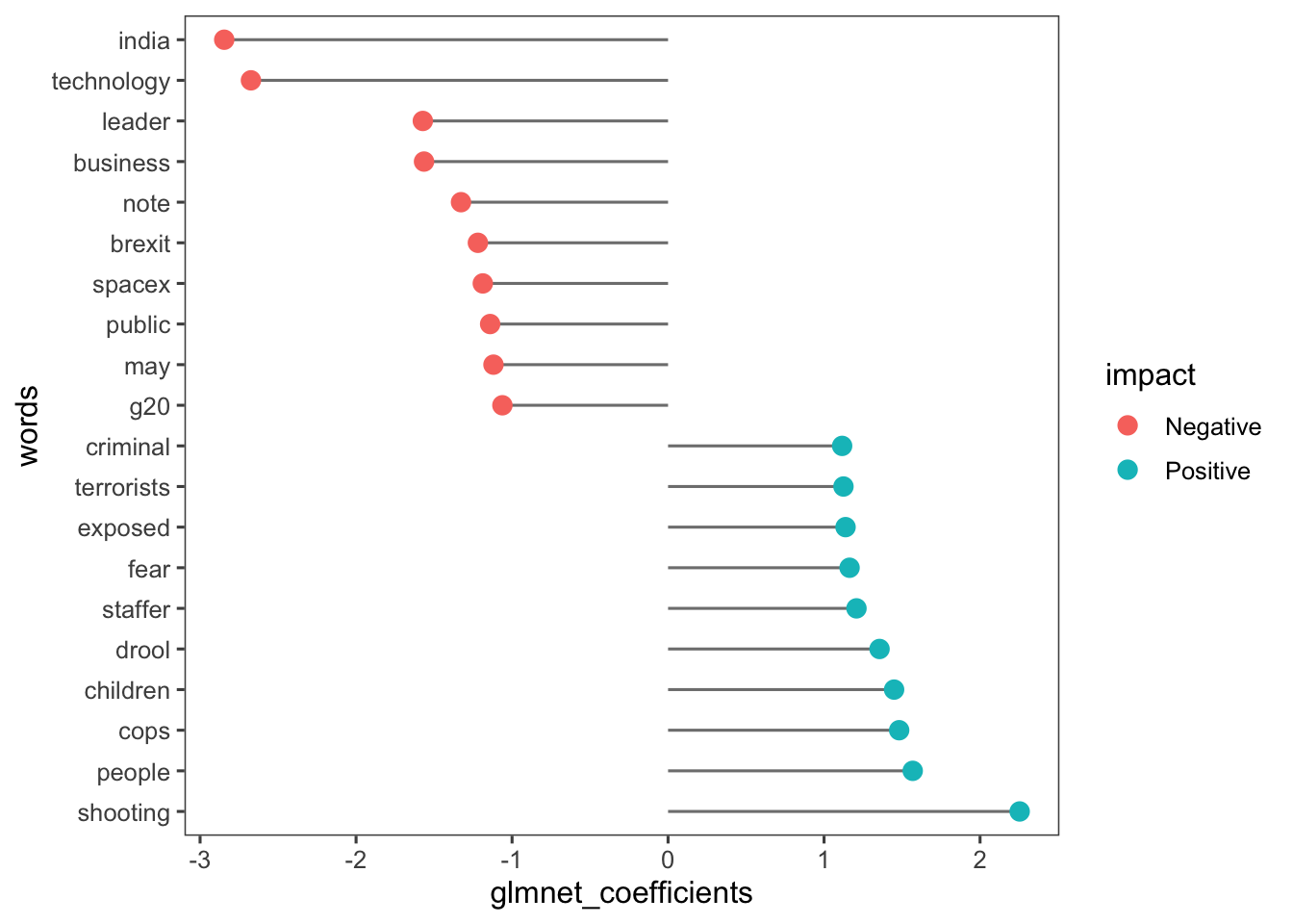 top.coef$impact <- ifelse(top.coef$glmnet_coefficients>0,"Positive","Negative")Veamos los resultados de los coeficientes más grandes gráficamente: