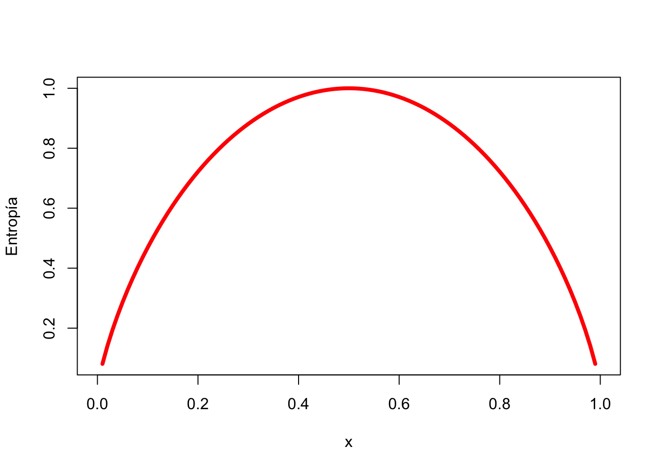 Podemos examinar la entropía para todos los posibles arreglos de dos clases. Si sabemos que la proporción de ejemplos en una clase es \(x\), entonces la proporción en la otra clase es \(1 - x\). Usando la función curve(), podemos trazar la entropía para todos los valores posibles de \(x\):