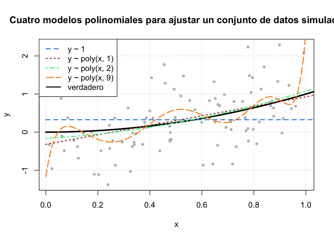 c("y ~ 1", "y ~ poly(x, 1)", "y ~ poly(x, 2)", "y ~ poly(x, 9)", "verdadero"),