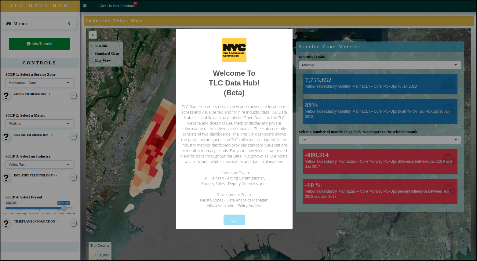 TLC Data Hub offers users a new and convenient location to access and visualize taxi and for hire industry data. TLC Data Hub uses public data available on NYC Open Data and the TLC website and does not use, track or display any private information of the drivers or companies. The Hub currently consists of two dashboards. The Trip Viz dashboard allows the public to run queries on TLC-collected trip data while the ‘Industry metrics’ dashboard provides standard visualizations of monthly industry trends.