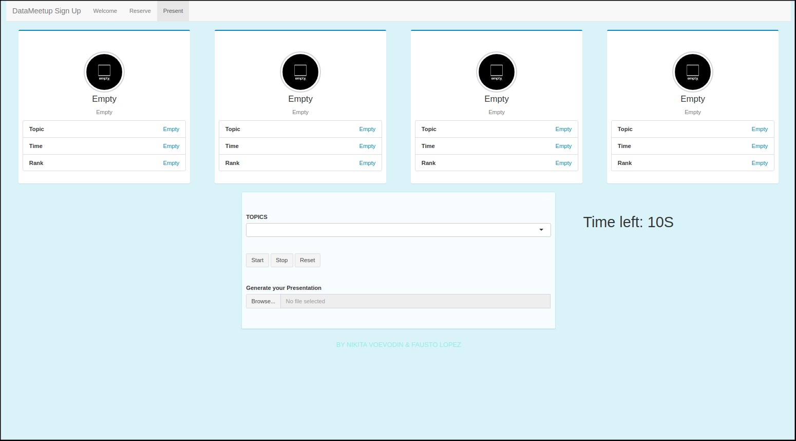 I am or used to be a host of monthly data meetups at TLC. TLC Data Meetup is or was a venue where employees interested in technology would come together to share ideas, tips, and tricks in relation to technology and their research. My manager Fausto Lopez and I created the following app to streamline the processes of registration and presentation.