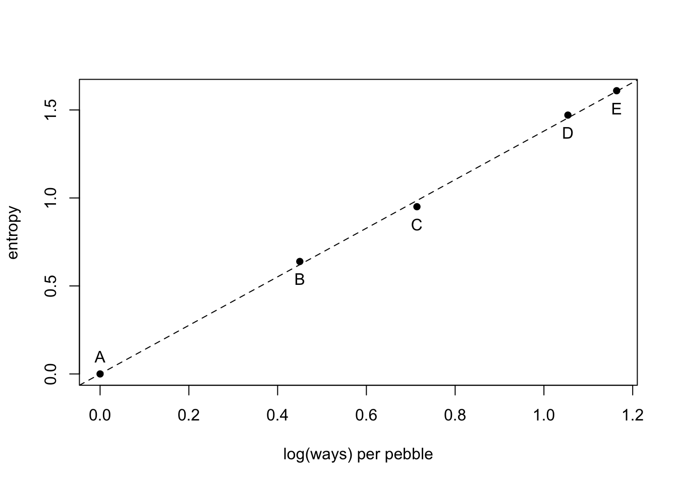 logwayspp <- log(ways)/10plot(x = logwayspp, y = H, xlab = "log(ways) per pebble", ylab = "entropy", pch = 16)