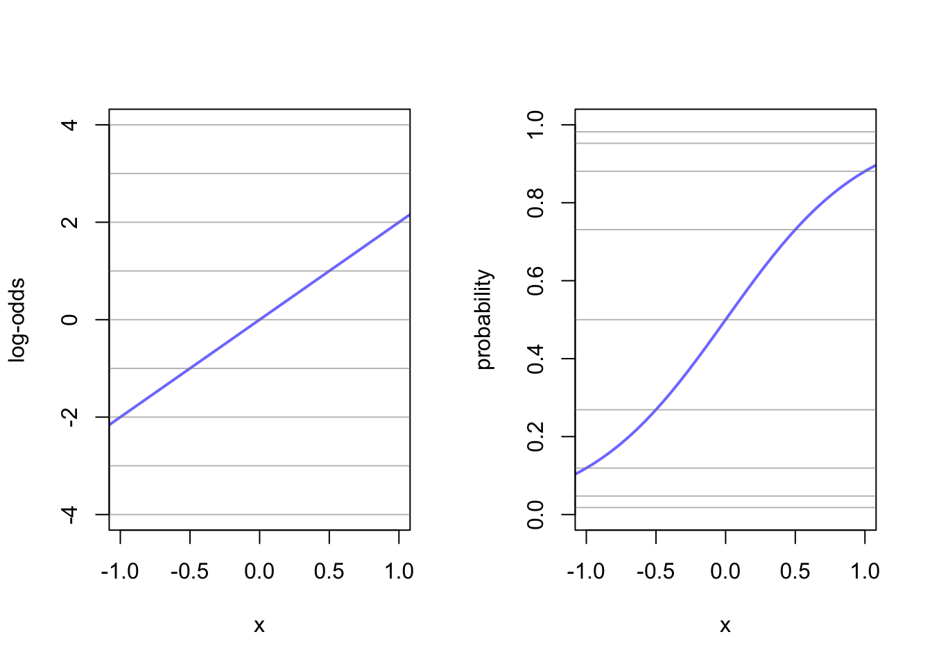 plot(x = df[,1], y = df[,2], xlim = c(-1,1), ylim = c(-4,4), type = 'l', xlab = "x", ylab = "log-odds", col = rangi2, lwd = 2)
