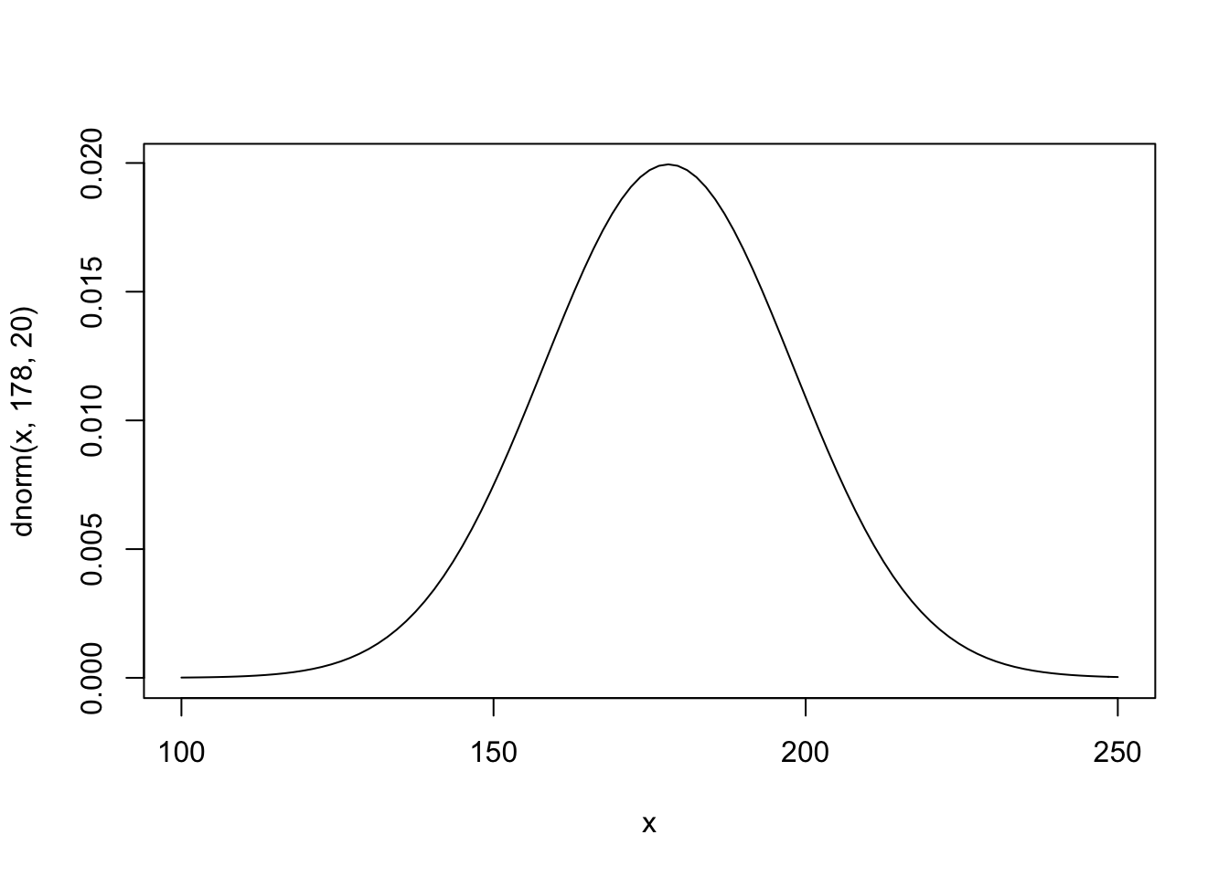 curve(dnorm(x, 178, 20), from = 100, to = 250)