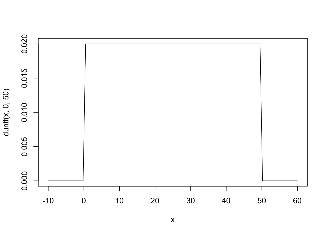 curve(dunif(x, 0, 50), from = -10, to = 60)