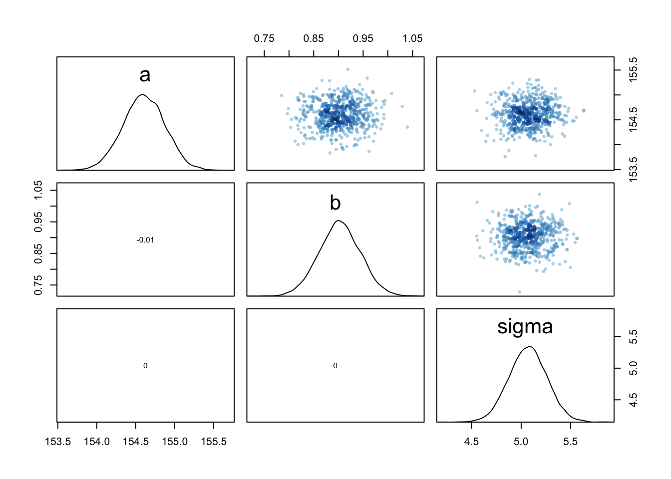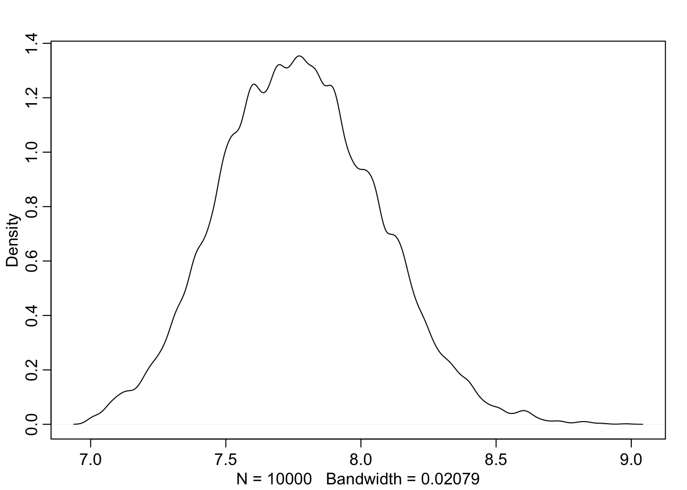 precis(d, hist=FALSE) #rethinking package## mean sd 5.5% 94.5%