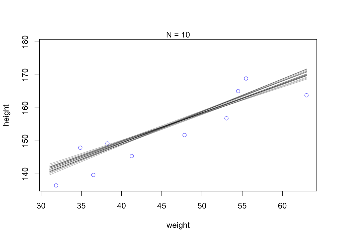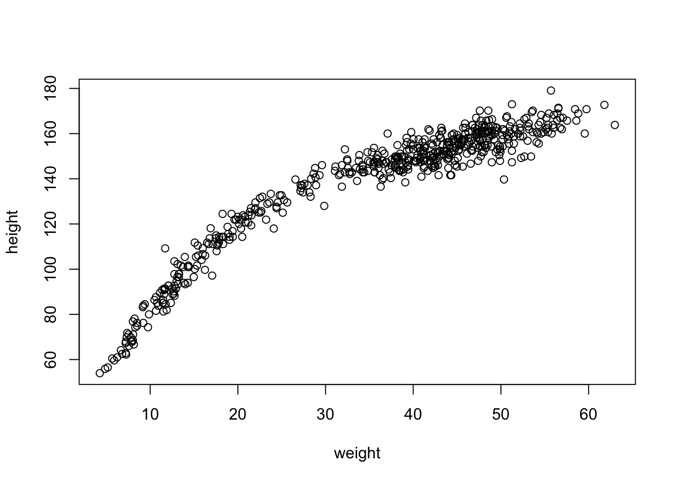 height.PI <- apply(sim.height, 2, PI, prob = 0.89) #calculate 89% intervals of heightplot(height~weight_s, d, type = 'n')