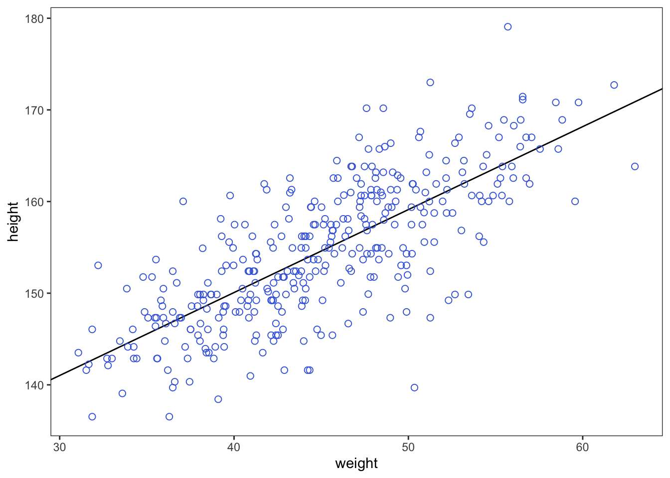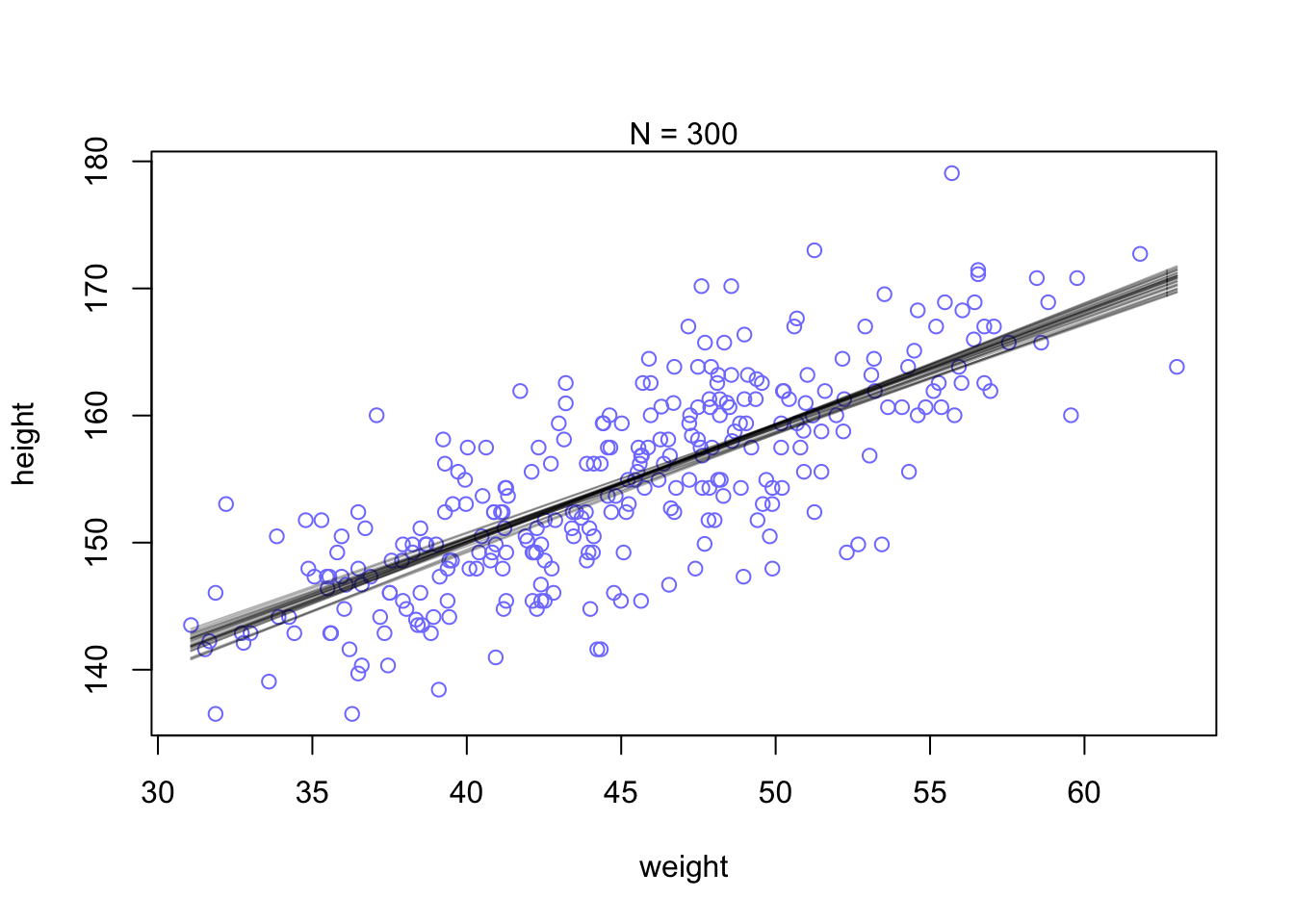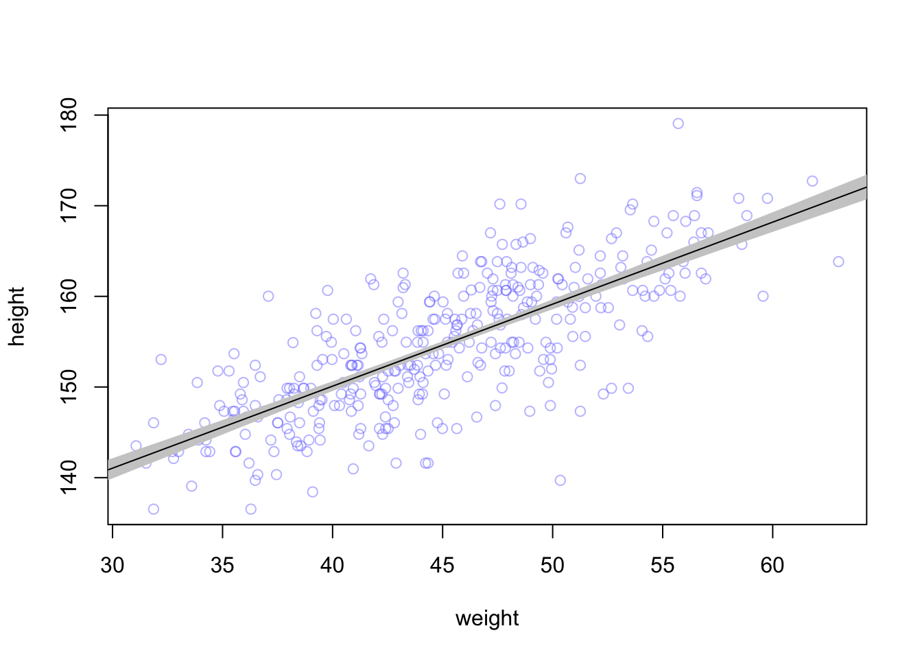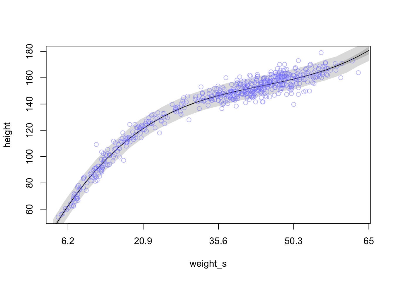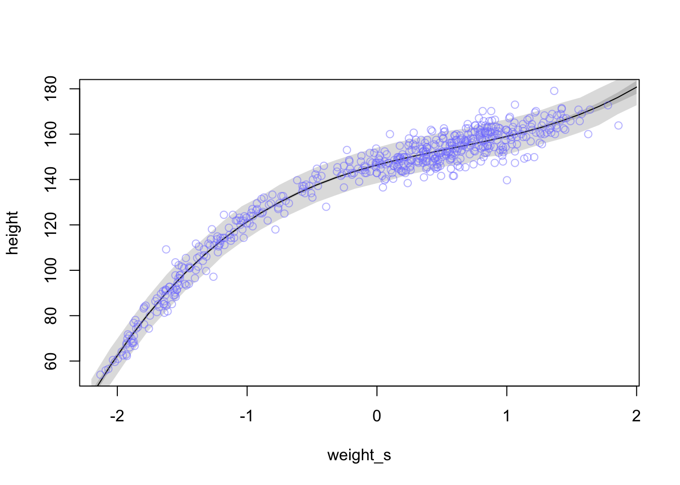 plot(height ~ weight_s, d, col=col.alpha(rangi2, 0.5), type = 'n', xaxt = 'n') #turn off x axis text