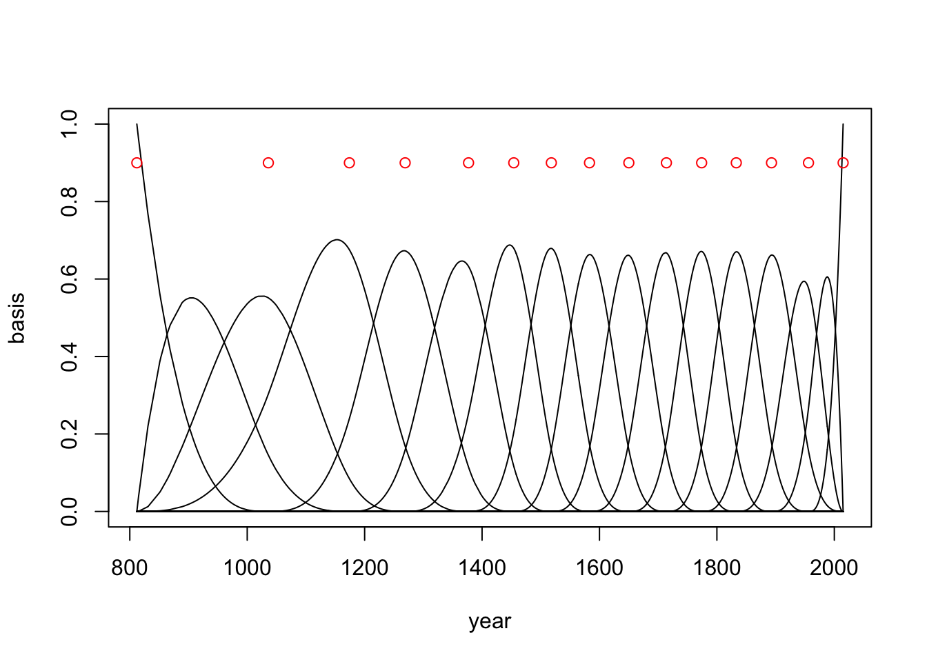 So now that we have the break points in the year range of the data we can assign a polynomial degree. This degree determines how many basis functions will be interacting in each year range. If we choose a cubic spline, four basis functions will be active in each year range.