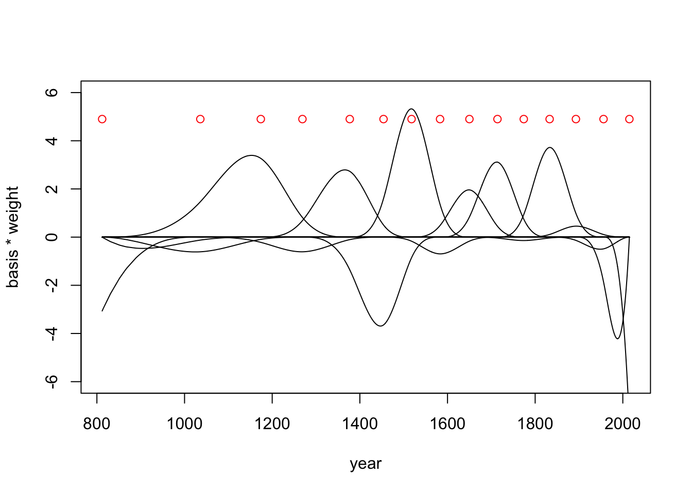 plot(NULL, xlim=range(d2$year), ylim=c(-6,6), xlab = 'year', ylab='basis * weight')