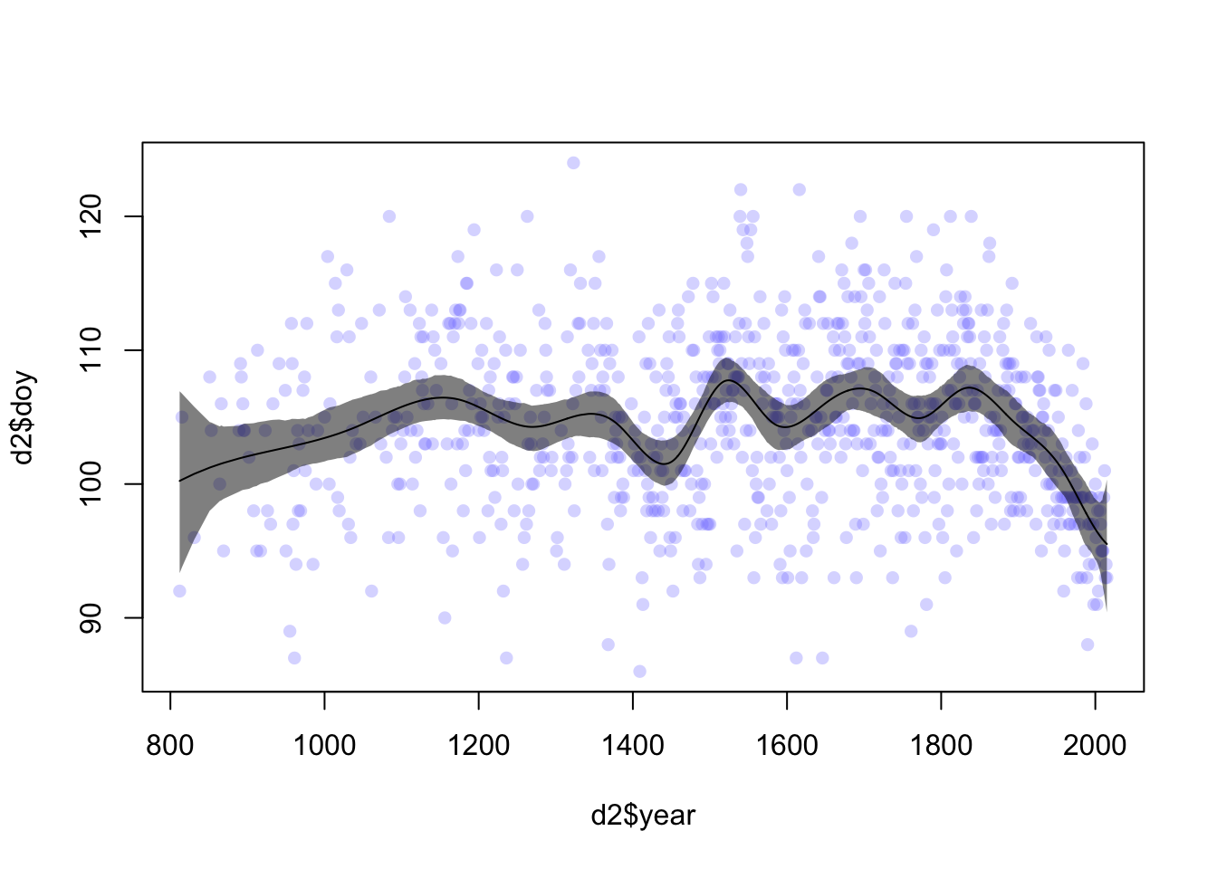 plot(d2$year, d2$doy, col = col.alpha(rangi2, 0.3), pch = 16)