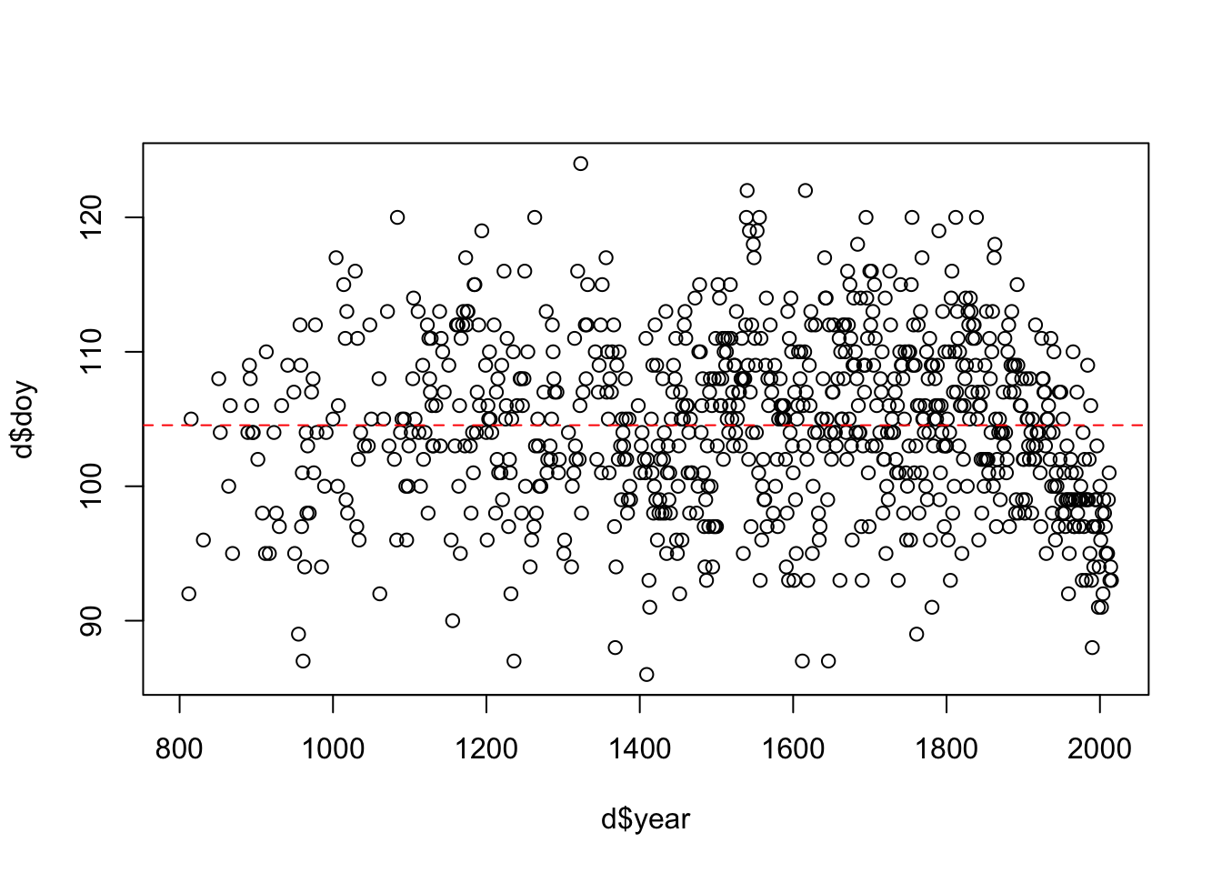 abline(h=mean(d$doy, na.rm = T), col = 'red', lty = 2)