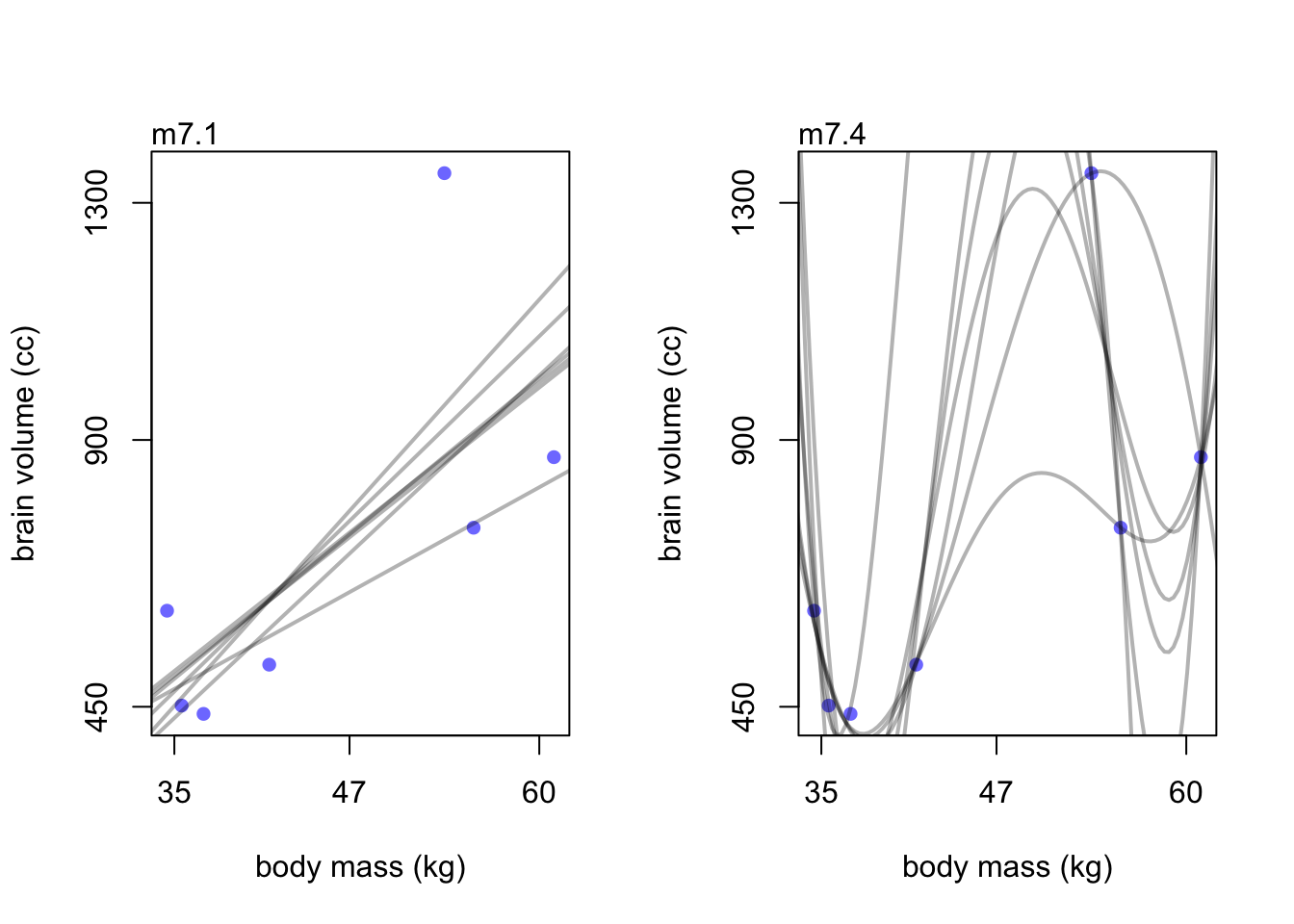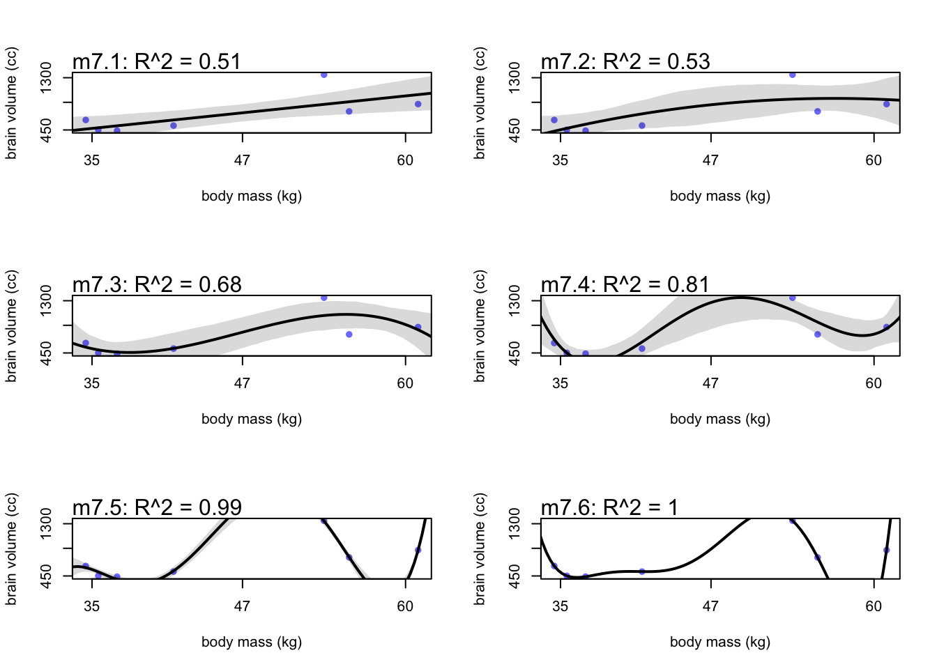 To get an output for m7.6, sigma had to be a constant small number because the model passes through each point without variance. You can also notice that these high \(R^2\) models do very poorly in data gaps. Between 41 and 54 kg, the higher order models go wildly positive, and then steeply dip between 55 and 60 kg.