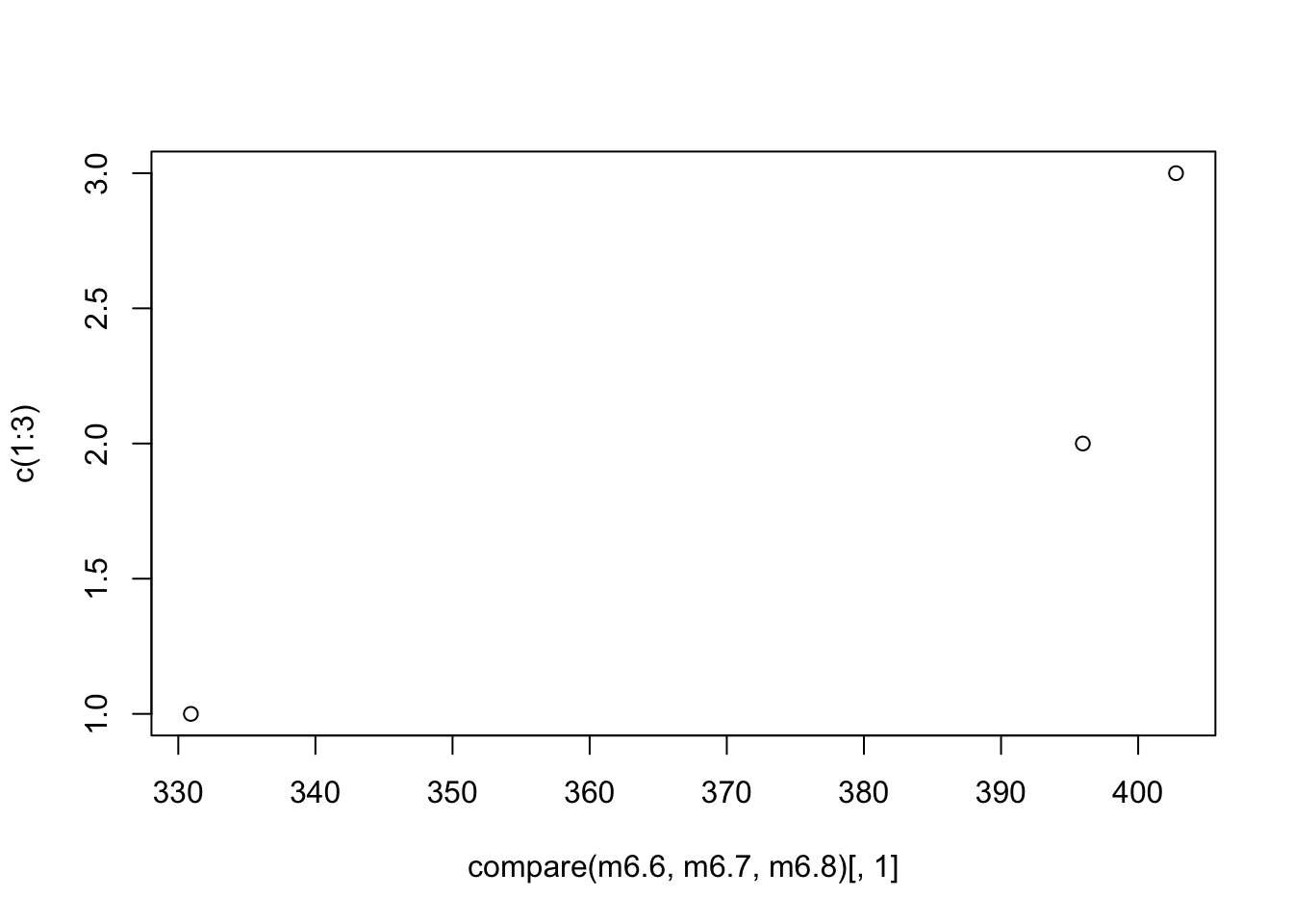 plot(x = compare(m6.6, m6.7, m6.8)[,1], y=c(1:3) ) #Fix this
