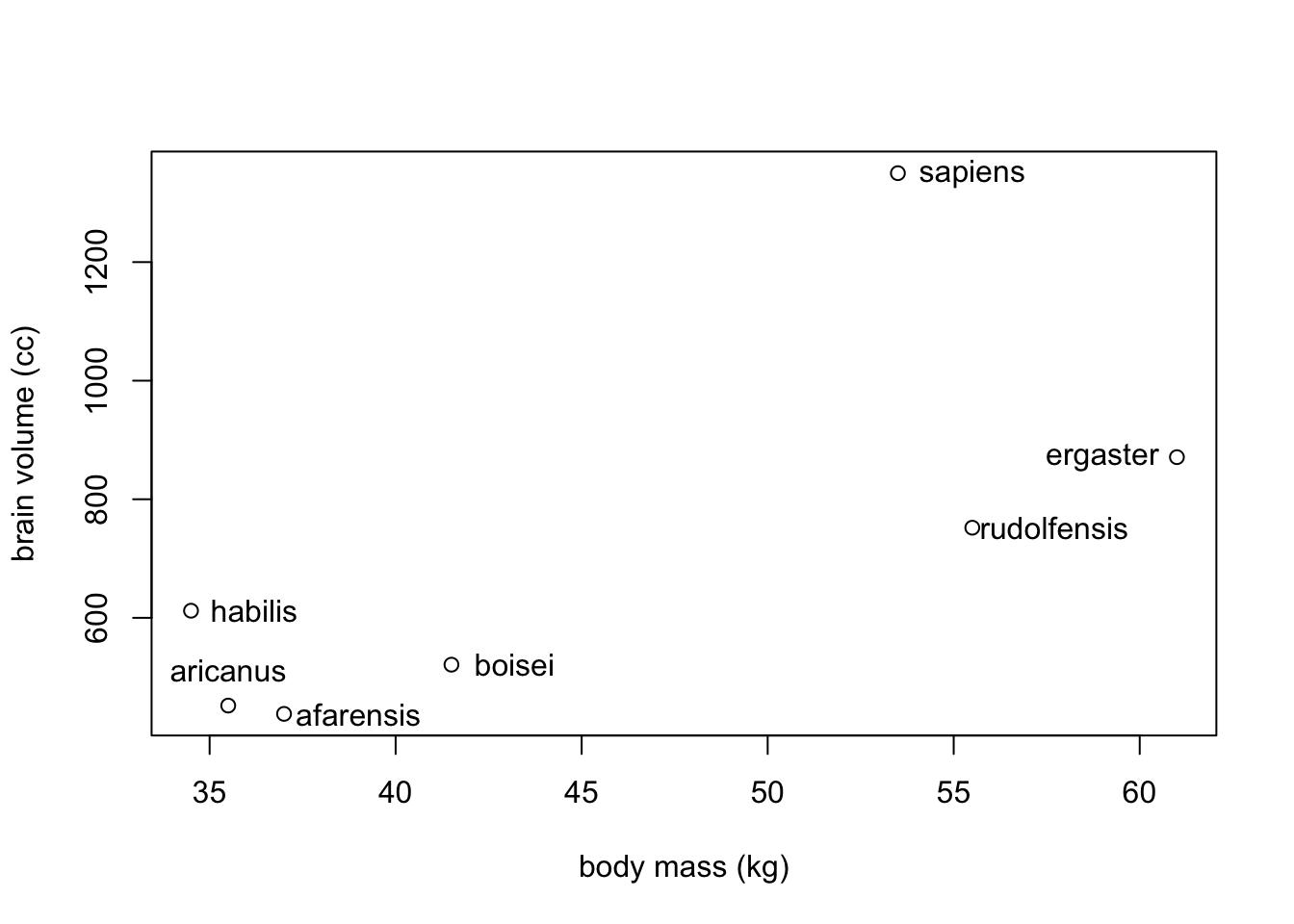 d <- data.frame(species=sppnames, brain=brainvolcc, mass=masskg)