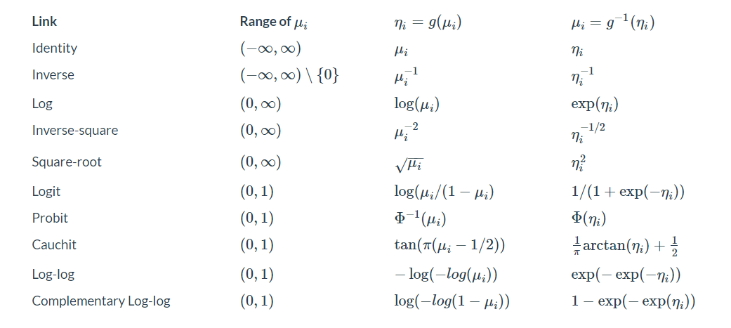 - 连接函数(\(g(.)\)), 将期望值映射到预测变量的线性组合 \[ g(\mu) = \eta \]