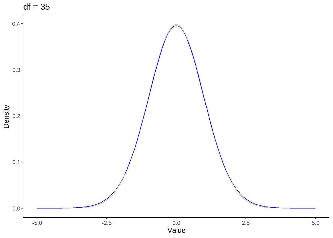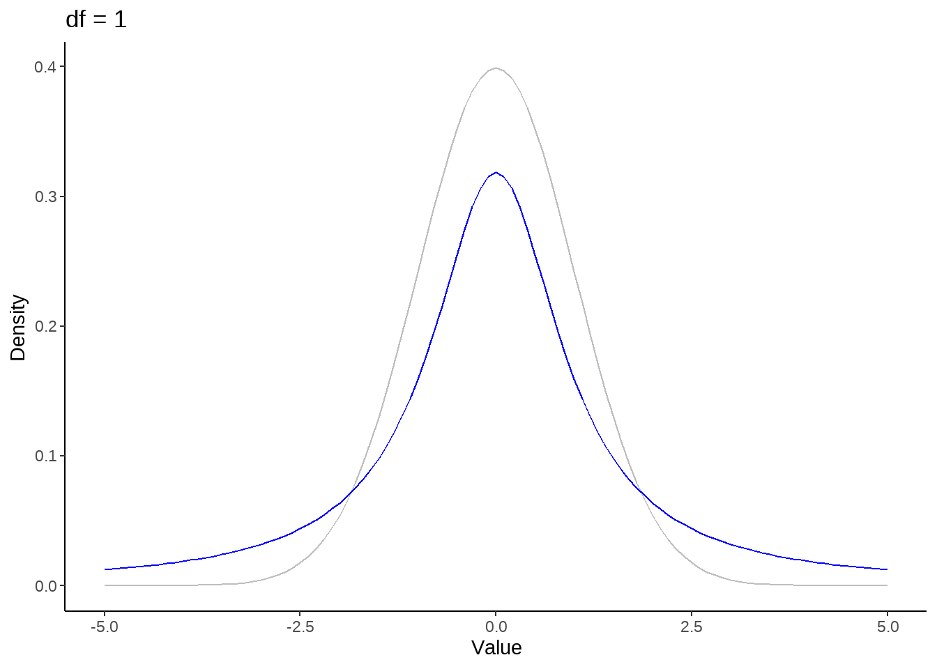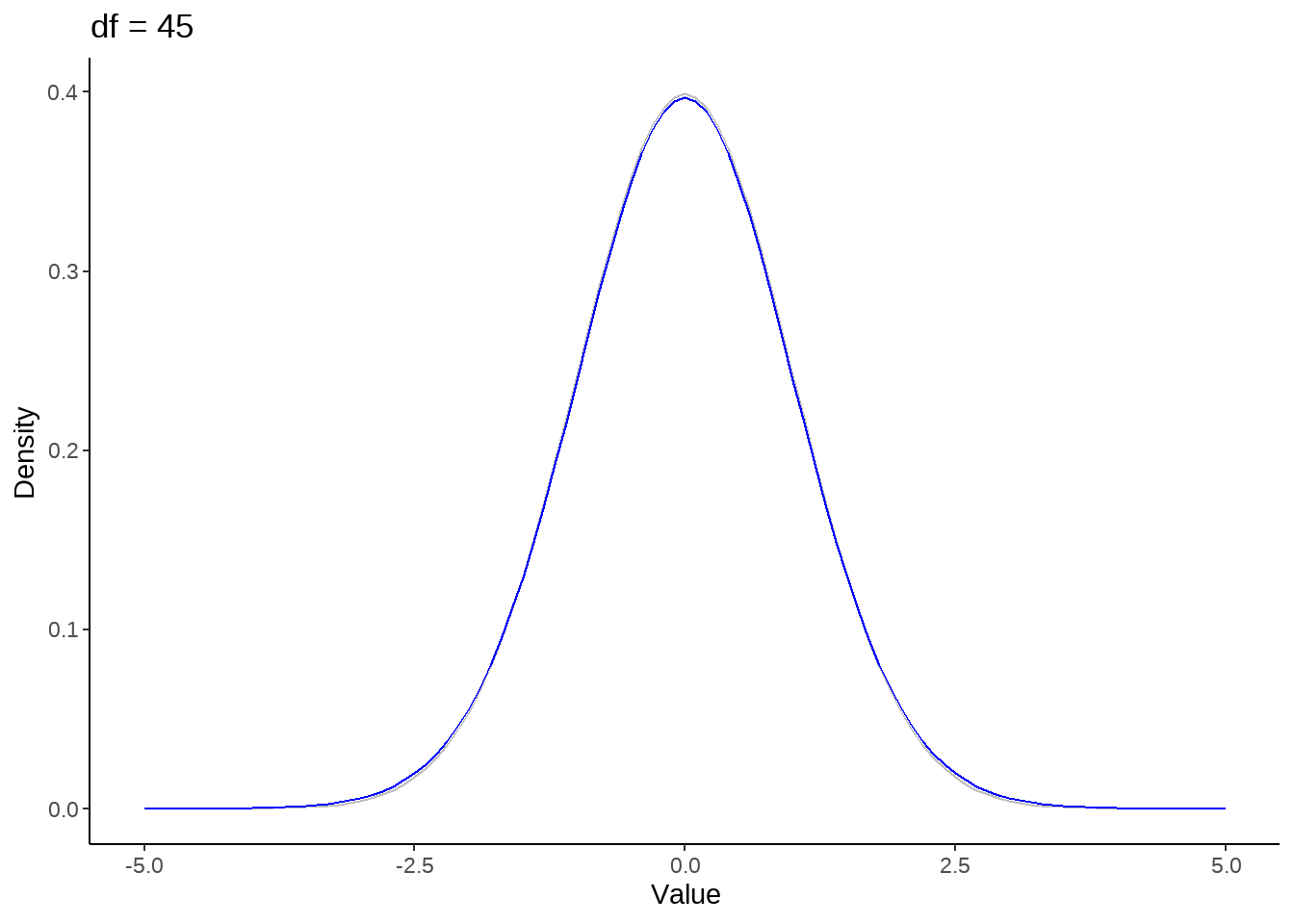 stat_function(fun = dt, args = list(df = nu), color = 'blue') +