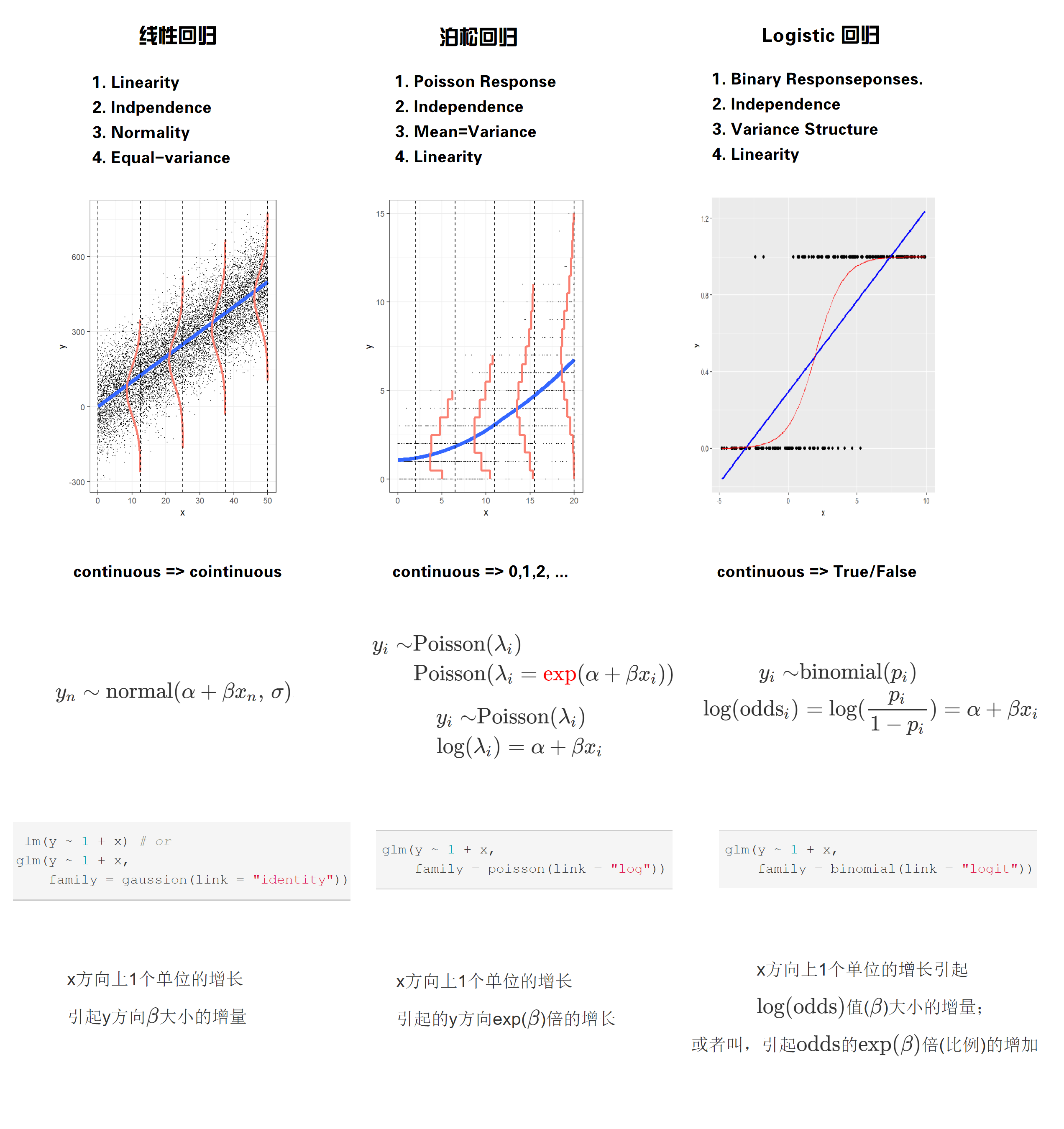 在之前线性模型中讲到,对每一次观测,被解释变量服从正态分布,那么,我们用解释变量的线性组合模拟正态分布的均值\(\mu_i\),即均值\(\mu_i\)随\(x_i\)变化