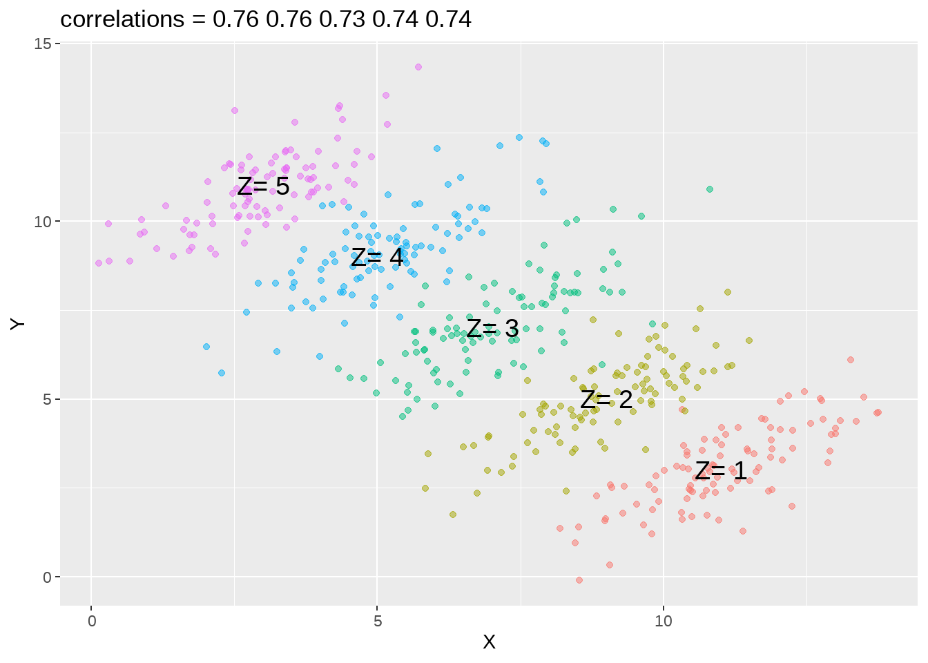 事实上,当我们把学生按照不同年级分成五组,再来观察学习时间和考试成绩之间的关联,发现相关性完全逆转了! 我们可以看到学习时间和考试成绩强烈正相关。