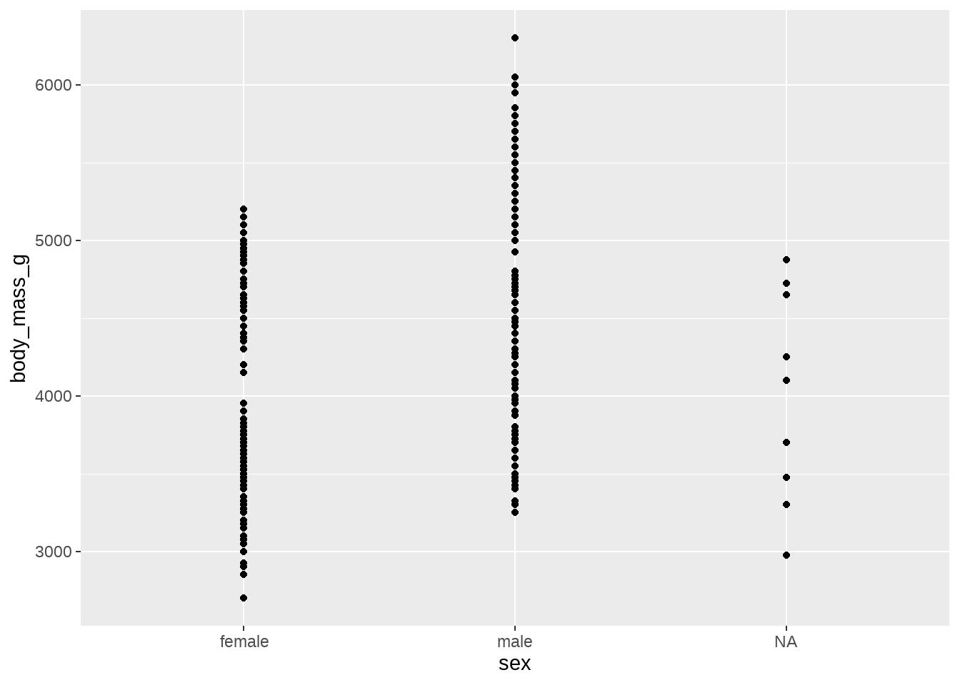 ggplot(data = penguins, aes(x = sex, y = body_mass_g)) +