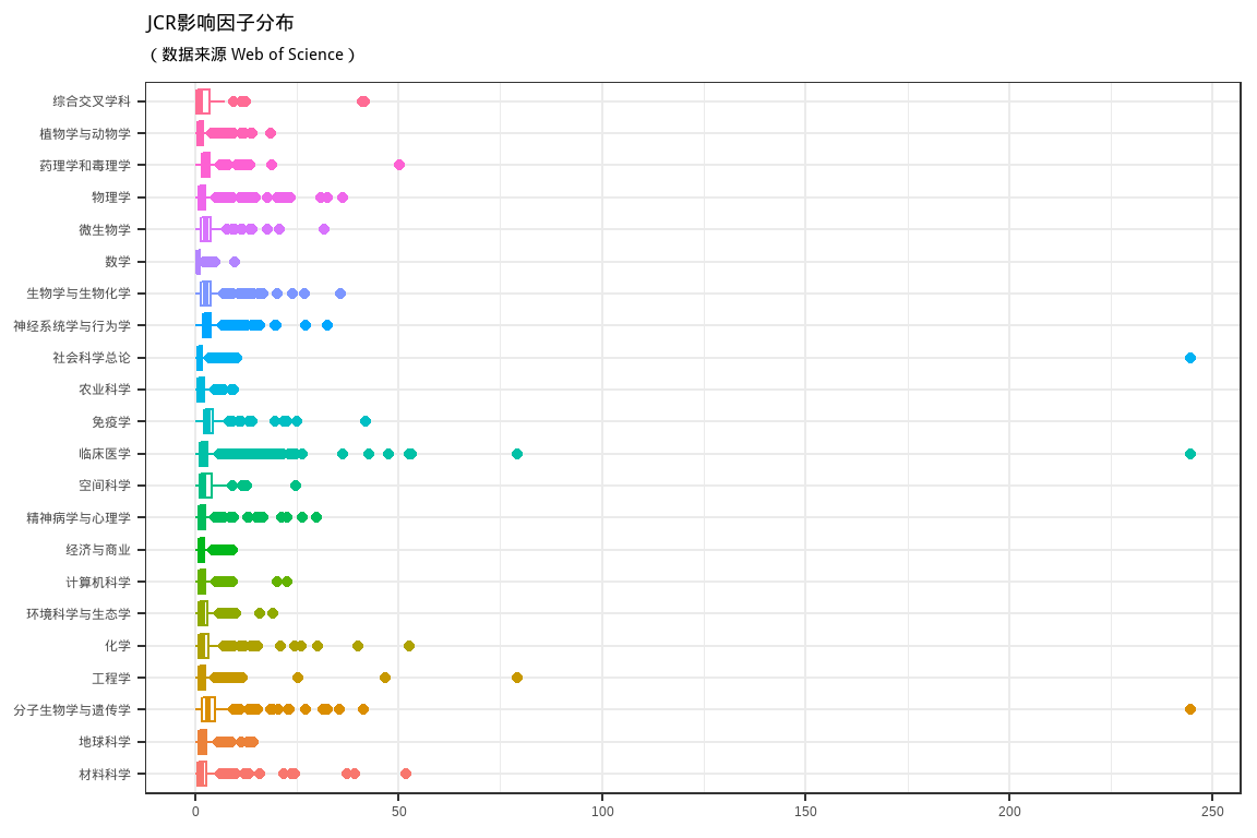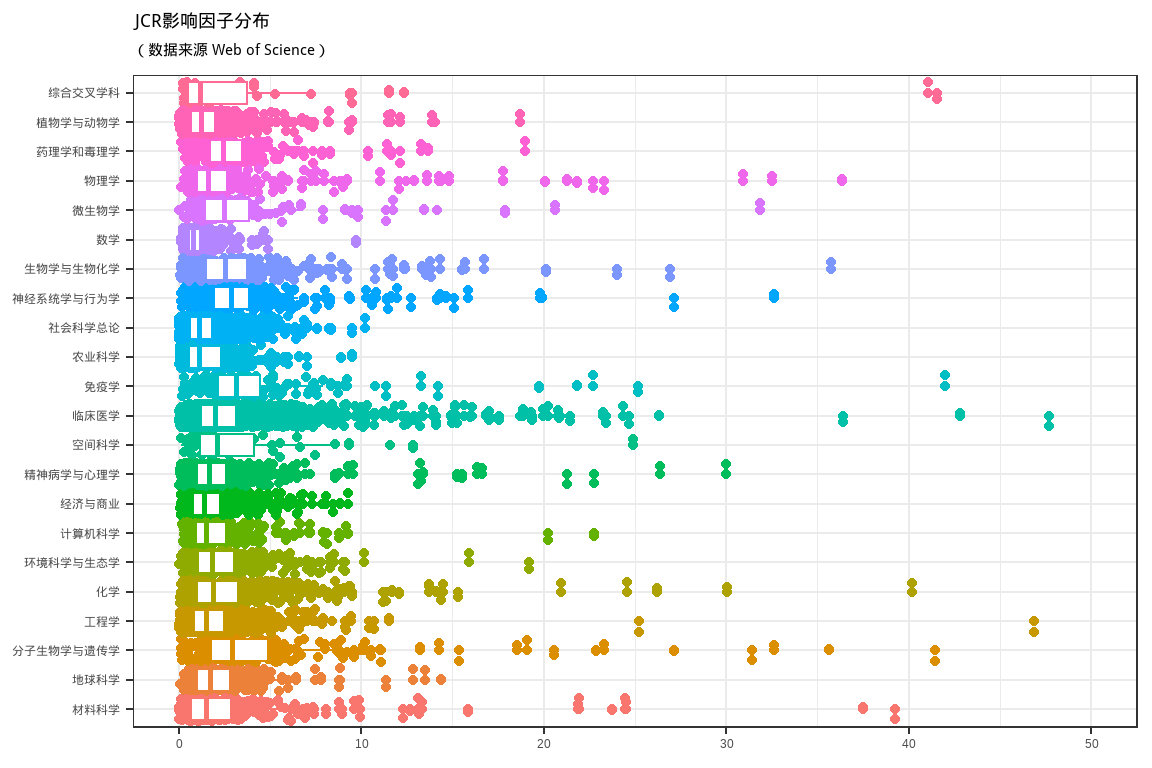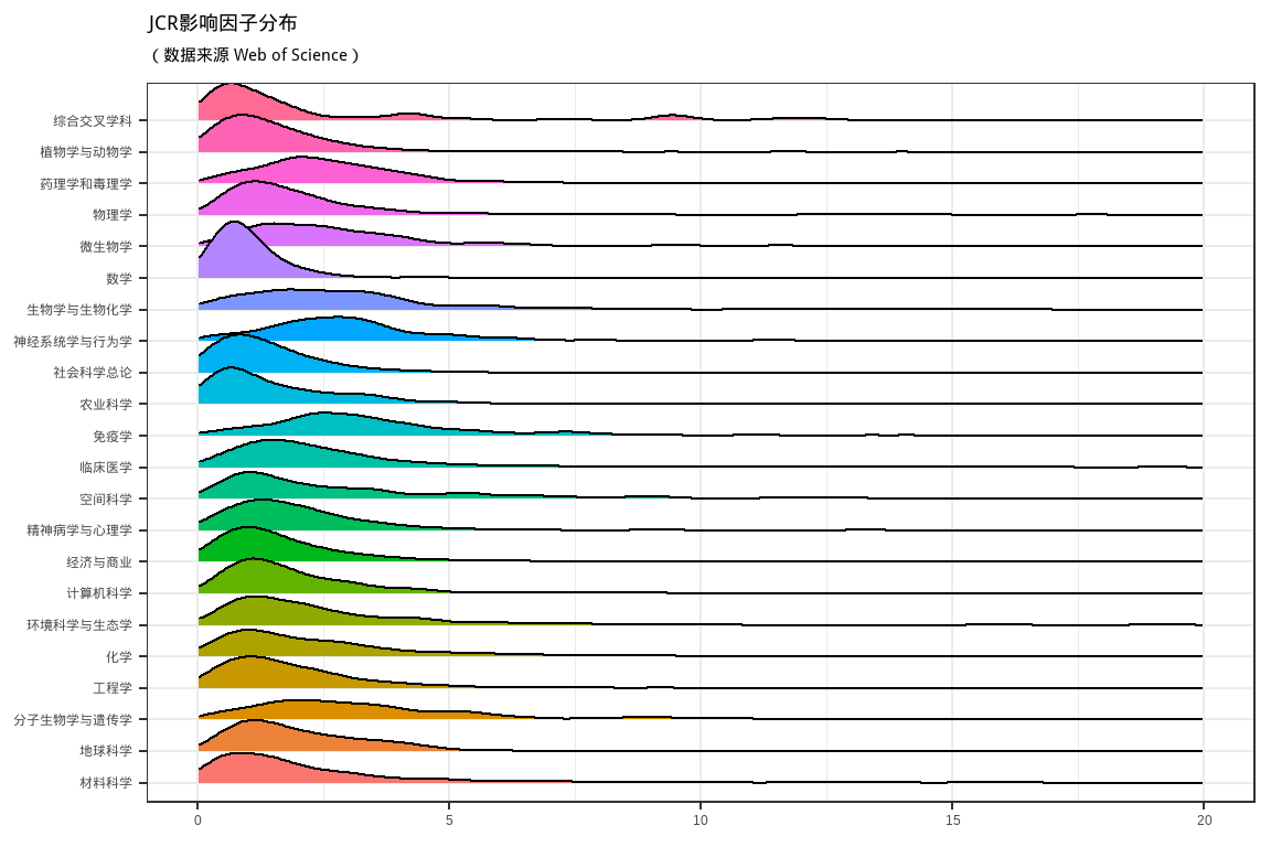 ggtitle("JCR影响因子分布", subtitle = '(数据来源 Web of Science)')