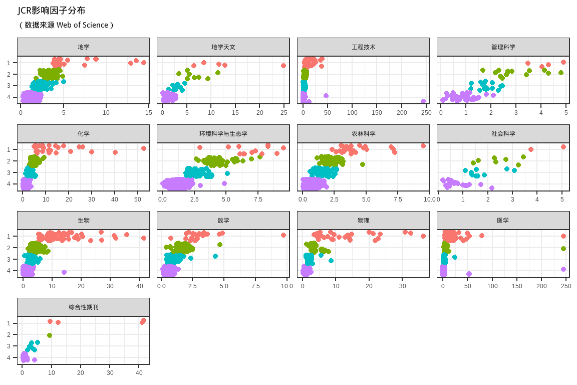 ggtitle("JCR影响因子分布", subtitle = '(数据来源 Web of Science)') +