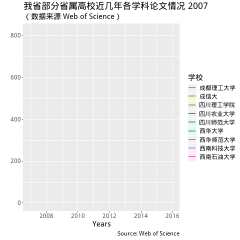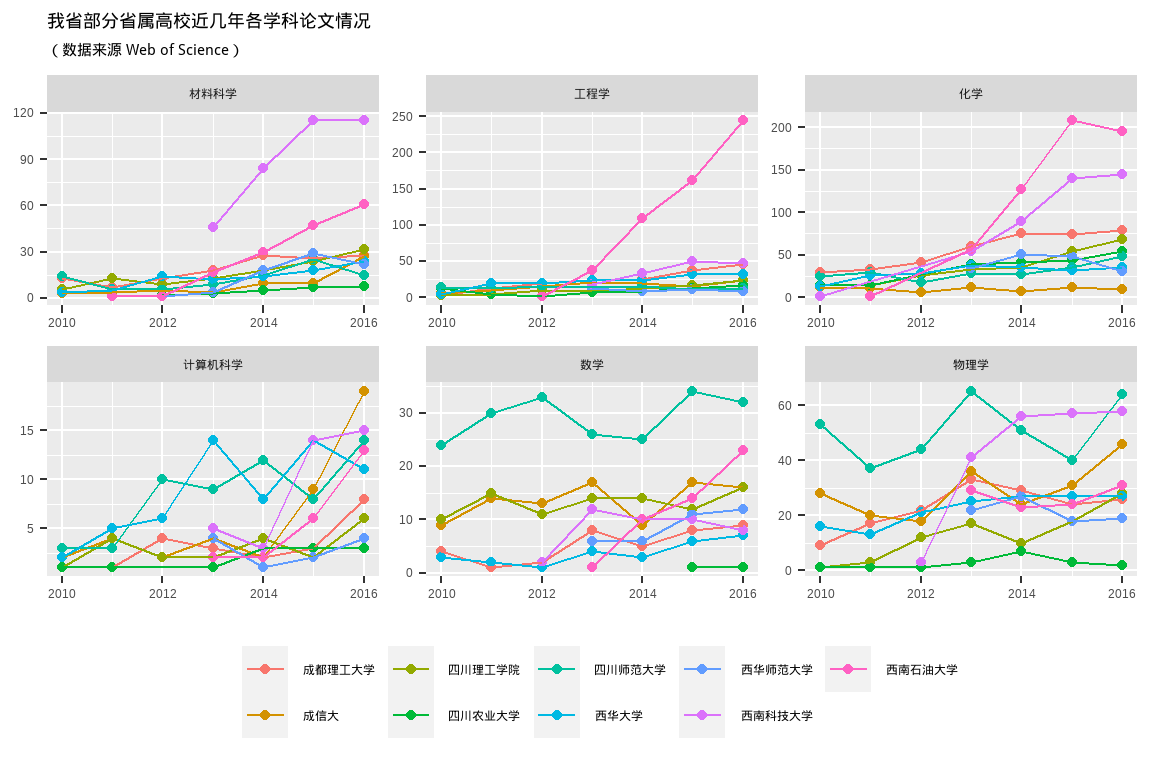 ggtitle("我省部分省属高校近几年各学科论文情况", subtitle = '(数据来源 Web of Science)') +