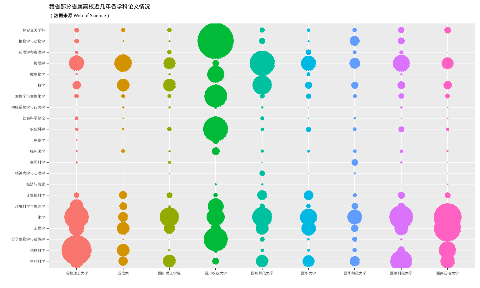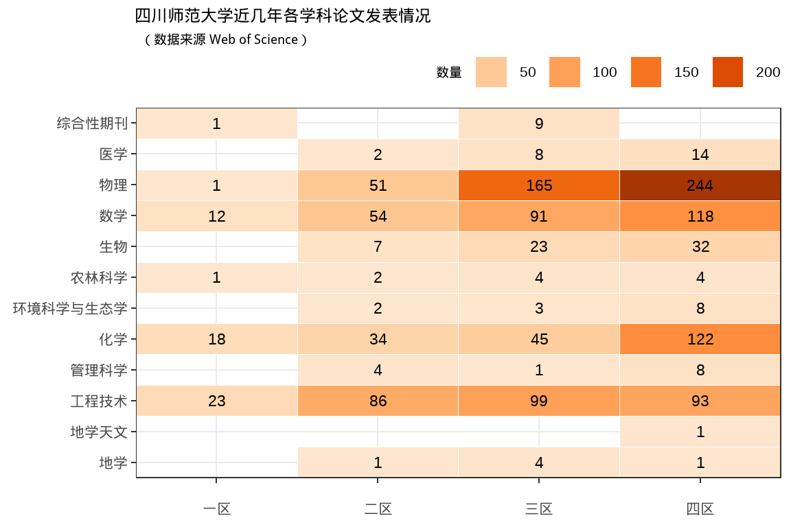 ggtitle("四川师范大学近几年各学科论文发表情况", subtitle = '(数据来源 Web of Science)') +
