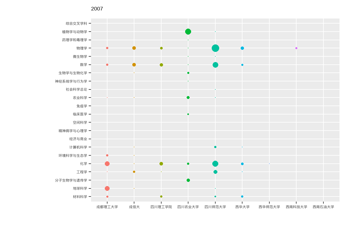 ggplot(aes(x = University_cn, y = Category_ESI_cn, colour = University_cn, fill = University_cn, size = sumpaper)) +