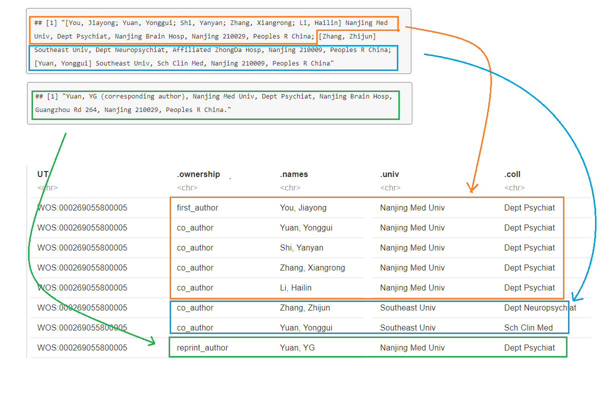 一篇文章如果有3个作者,那么归属为1个“first_author,” 2个“co_author,” 返回的结果还会包括通讯作者“reprint_author”。一般情况下,通讯作者来自这3个作者中的一个或者几个,因此,这条题录,最终会返回有3+n行,这里的n是指通讯作者的个数,通讯作者不分前后。(通讯作者都要搞几个,唉,学术啊)