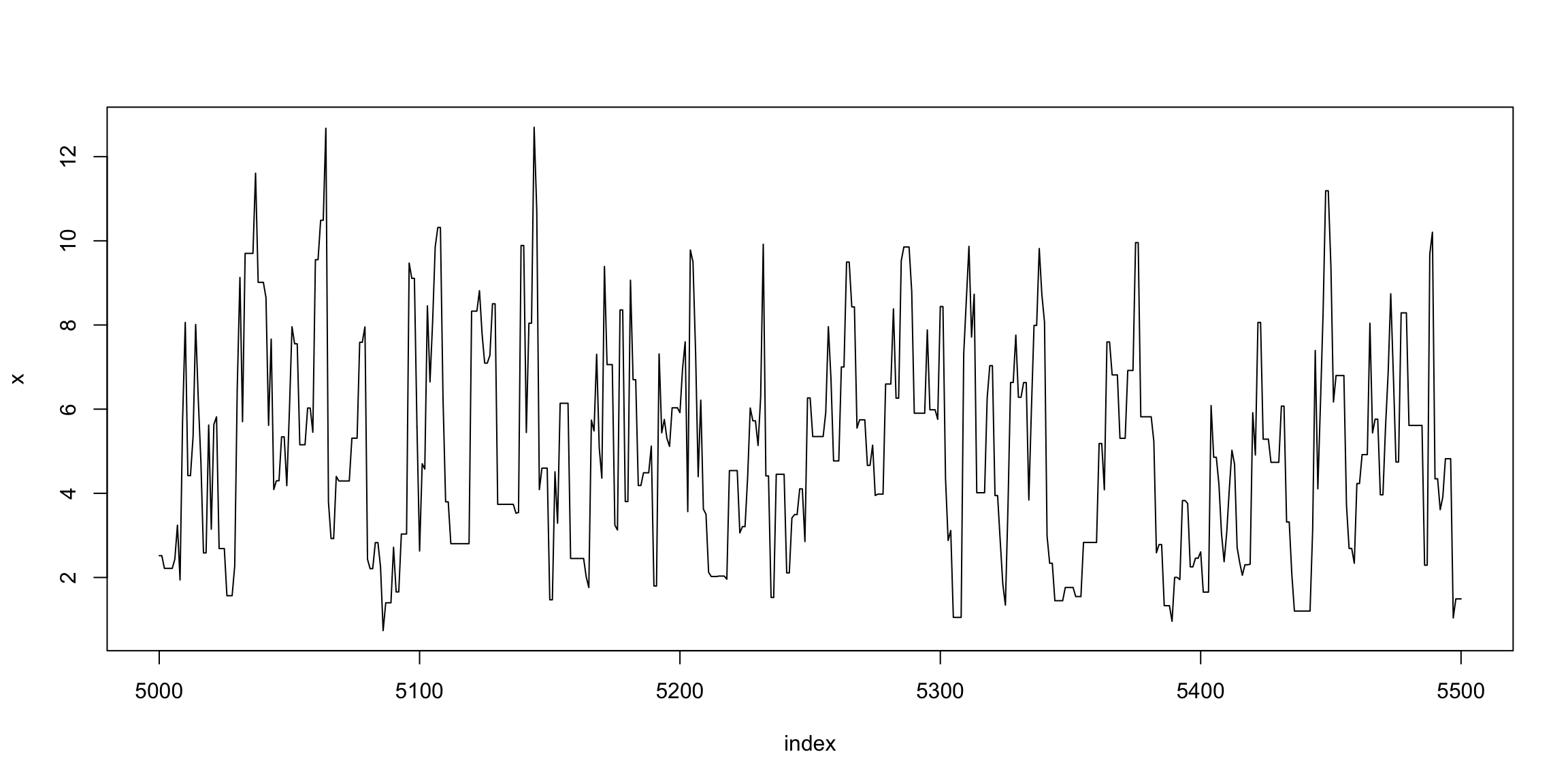 plot(index, x[index], type = "l", main = "", ylab = "x")