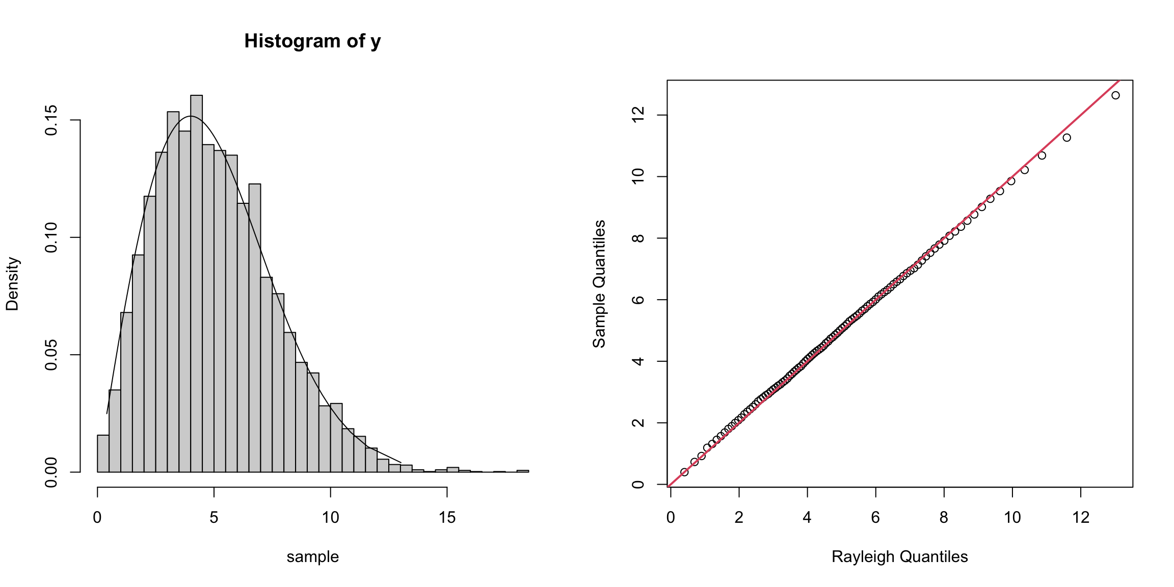 qqplot(QR, Q, xlab = "Rayleigh Quantiles", ylab = "Sample Quantiles")