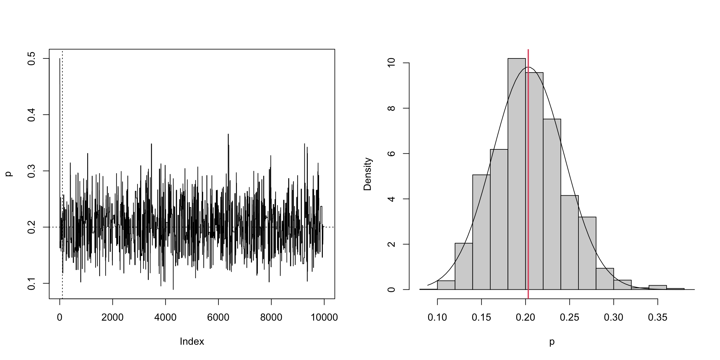hist(xt[-(1:1000)], main = "", xlab = "p", prob = TRUE)