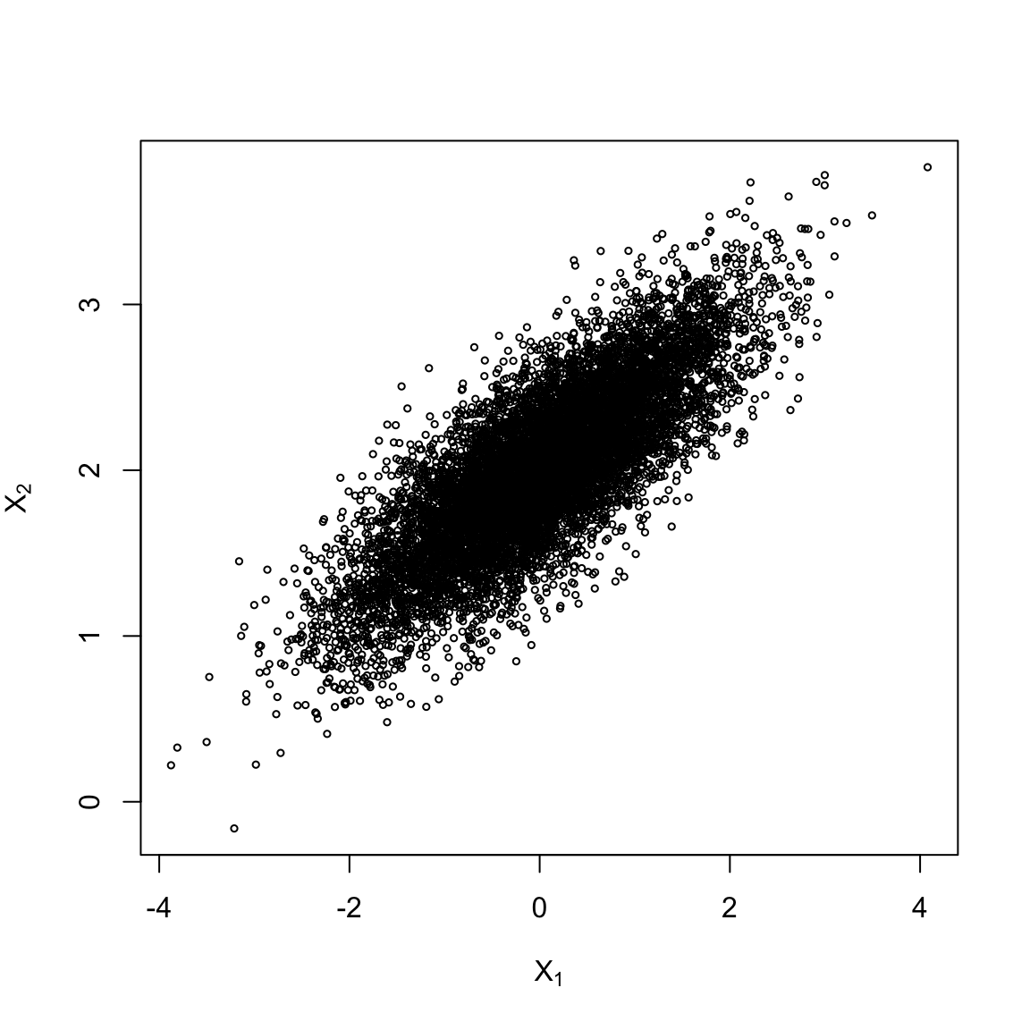 plot(x[,1], x[,2], xlab = bquote(X[1]), ylab = bquote(X[2]),