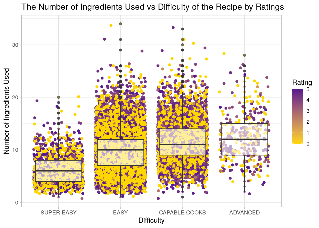 ggtitle("The Number of Ingredients Used vs Difficulty of the Recipe by Ratings")