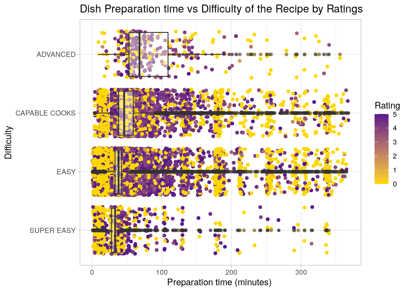 ggtitle("Dish Preparation time vs Difficulty of the Recipe by Ratings")+coord_flip()