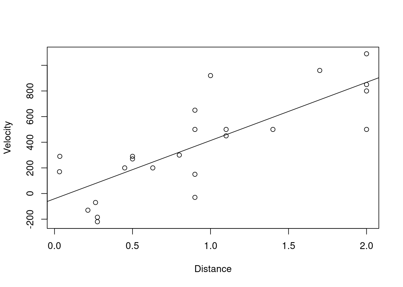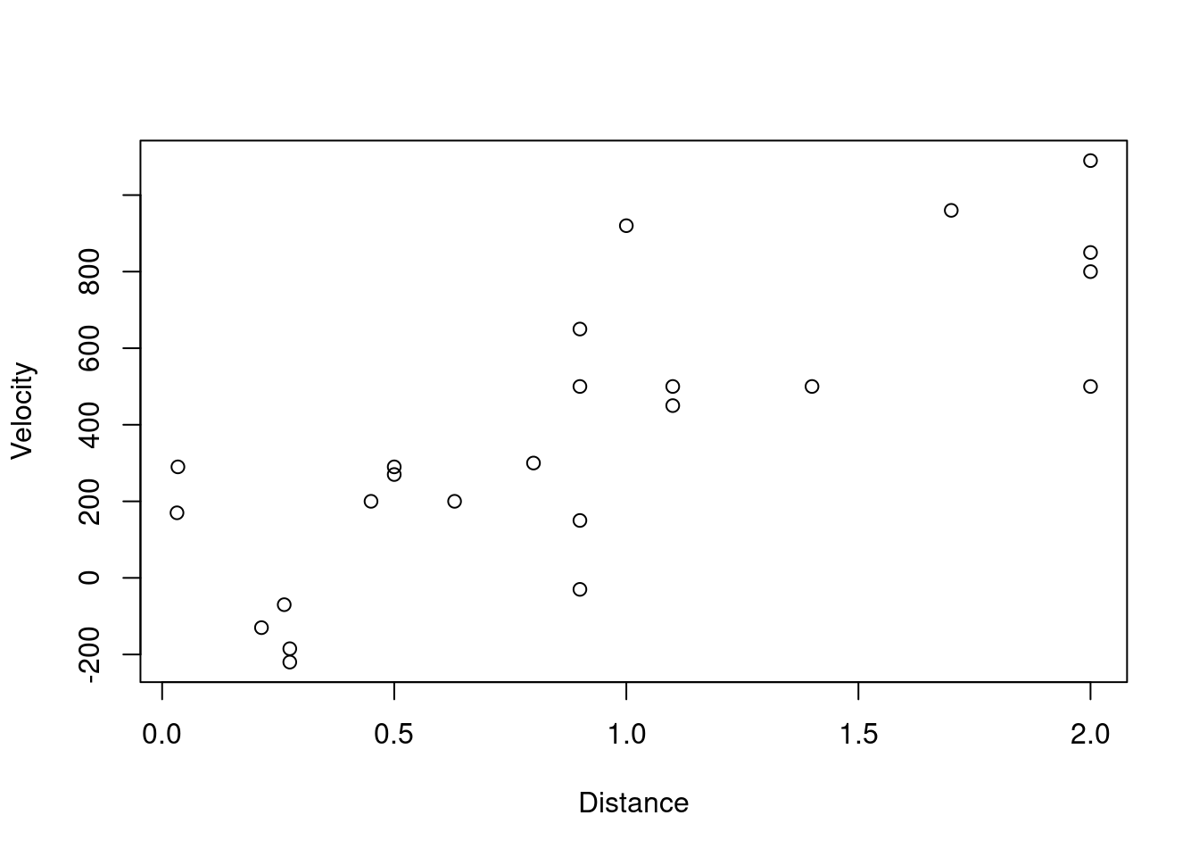 plot(Velocity ~ Distance, data = hubble, xlab="Distance", ylab="Velocity")