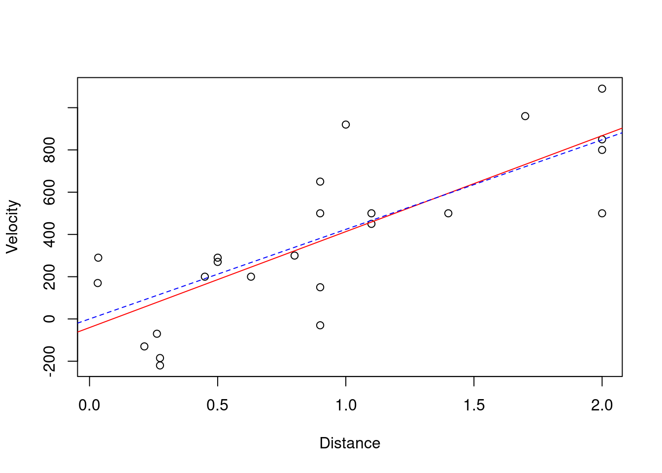 lm(Velocity ˜ -1 + Distance, data = hubble)