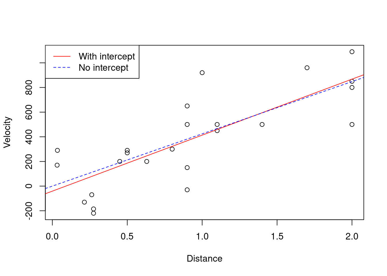 legend("topleft", c("With intercept", "No intercept"), col = c("red", "blue"), lty = c(1, 2))