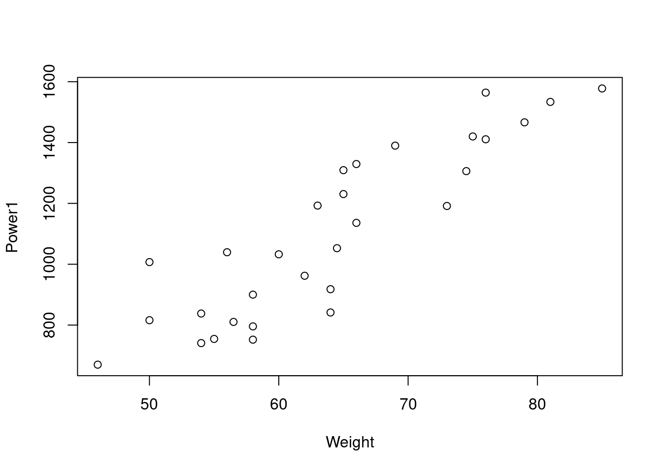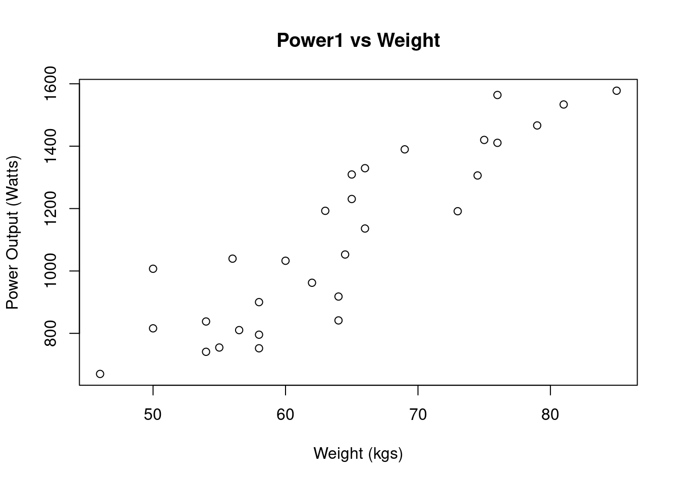 plot(Power1 ~ Weight, data = phys, main="Power1 vs Weight", xlab = "Weight (kgs)",