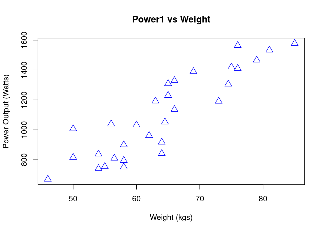 ylab = "Power Output (Watts)", pch = 2, cex = 1.5, col = "blue")iv. What can we say about the relationship between Power Output and Weight?