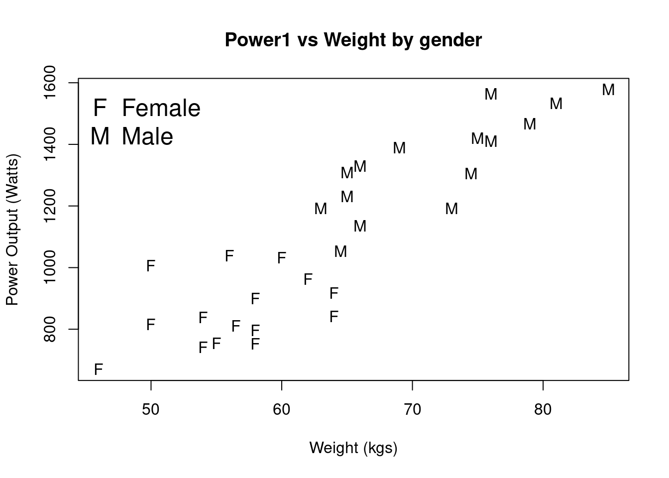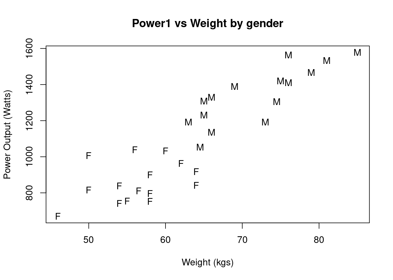 ylab = "Power Output (Watts)", main= "Power1 vs Weight by gender", pch = Gender1)
