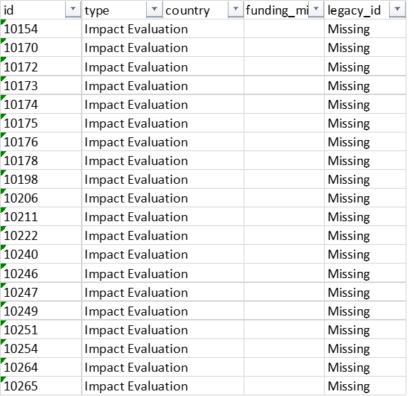 The application provides an option to download a comprehensive list of all missing values associated with each ID. In the downloaded document, cells labeled “Missing” indicate where data is absent, while empty cells signify areas where data input is complete.