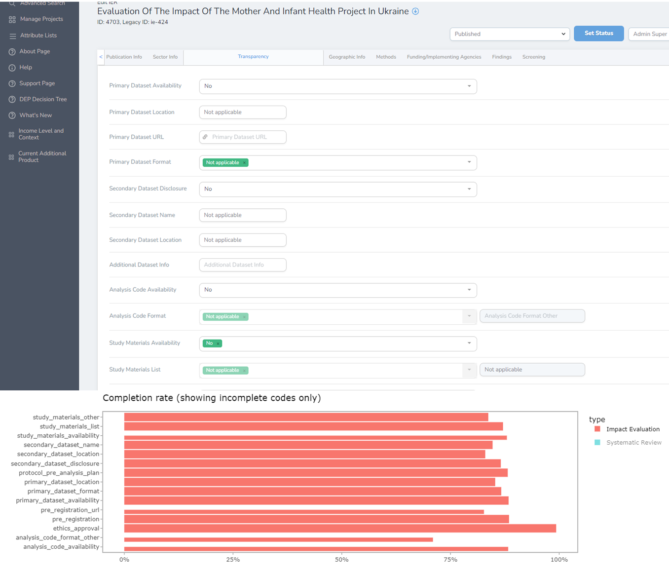 Dive deeper into the data at the individual input level. It’s important to note that certain tabs within the DEP require specific data fields to be completed. For example, the transparency information section encompasses over 10 distinct items, and the application displays the response rate for each of these items. By selecting a type, you can filter the visualization to highlight either Impact Evaluations or Systematic Reviews. Additionally, an accompanying table will list the study IDs that contain missing values for each scrutinized item.