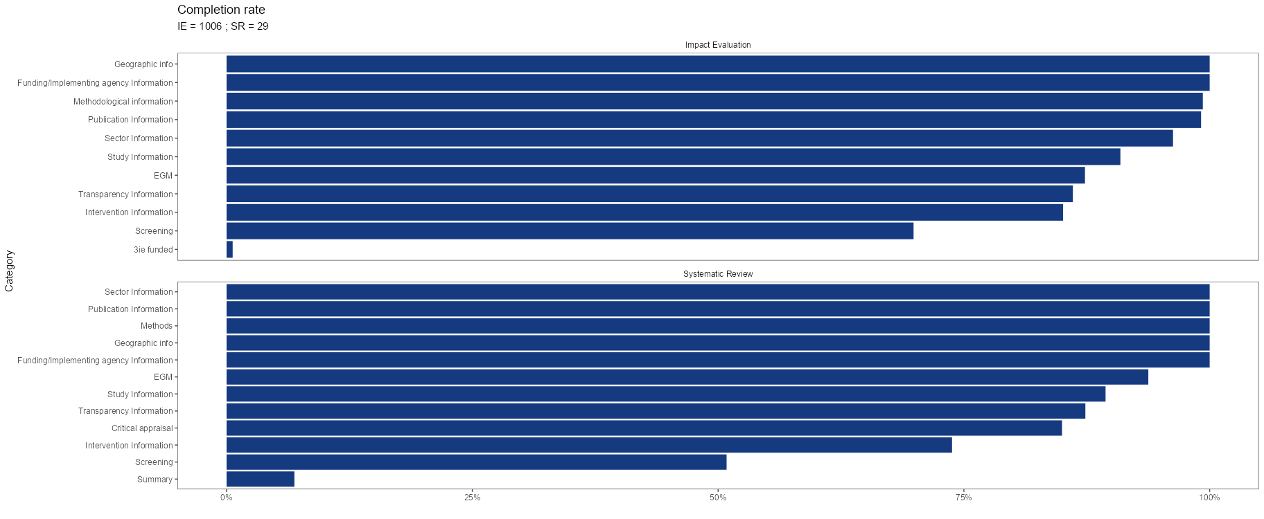 The initial plot provides a visual assessment of the completion rates for Impact Evaluations and Systematic Reviews. It breaks down the data by each input tab within the DEP portal and the EGM custom coding. A completion rate of 100% indicates there are no missing values in that section.