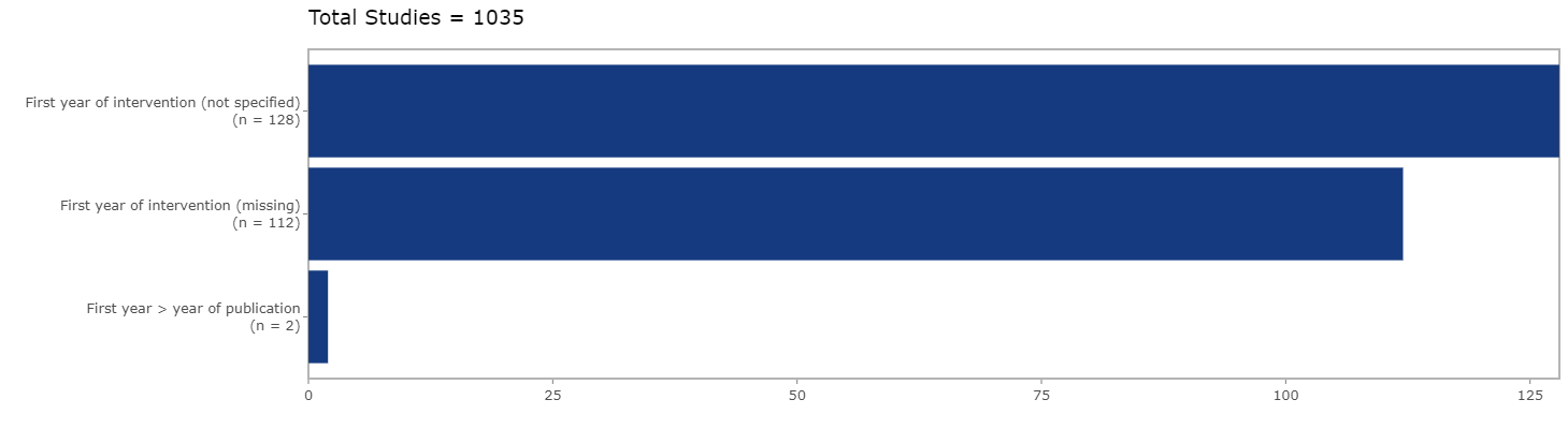 The dataset should logically have the year of publication following the first year of intervention. Pay attention to the bar at the bottom, which indicates instances where the first year of intervention is erroneously recorded as occurring after the year of publication. Within this plot, hovering your mouse over individual bars will reveal the record IDs associated with these outliers.
