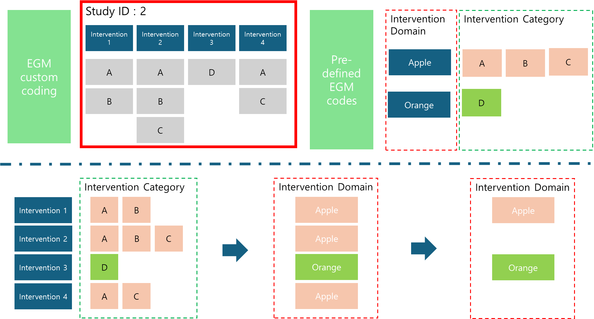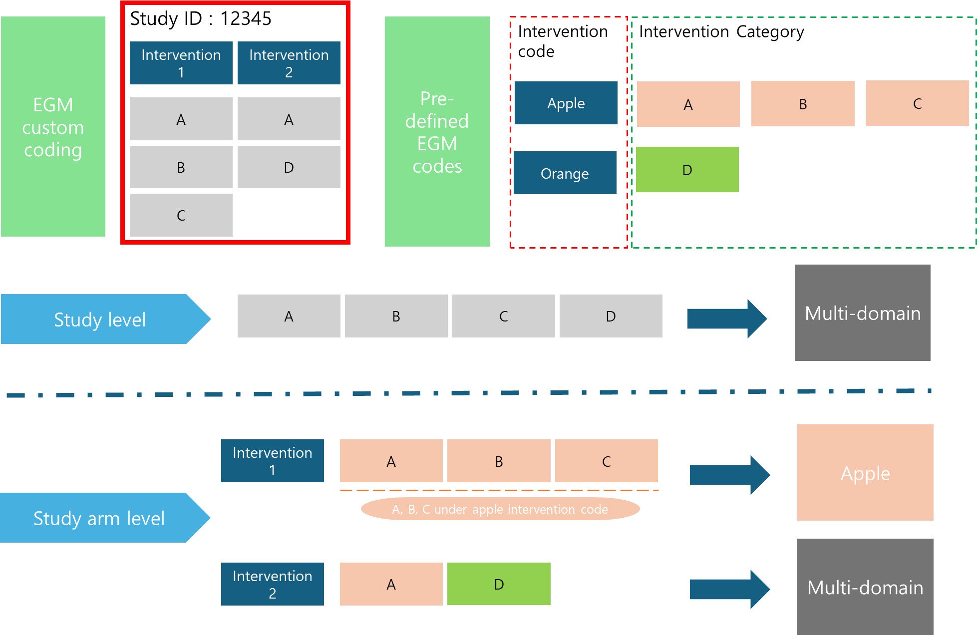 Conversely, at the study arm level, each treatment arm is treated as a distinct entity, which typically leads to a higher count of interventions compared to the number of studies. The decision-making process for categorizing each intervention is illustrated below. For example, the first intervention is categorized under the “Apple” intervention after components A, B, and C are all found to belong to subcategories within the Apple intervention group. The second intervention, combining elements A and D from different intervention groups (Apple and Orange, respectively), is coded as “Multi-domain.” This classification is made by examining the most specific codes to determine if they fall under the same overarching intervention category.