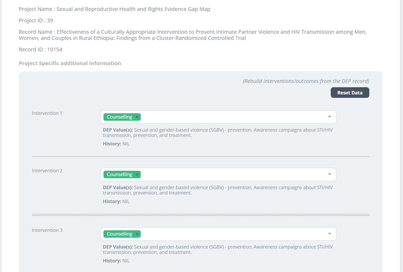 The application automatically removes any duplicated treatment arms within the data. For example, if for a particular DEP ID (10154), multiple entries of the same intervention domains are recorded, the system retains only one instance, eliminating the redundancies to streamline the dataset.