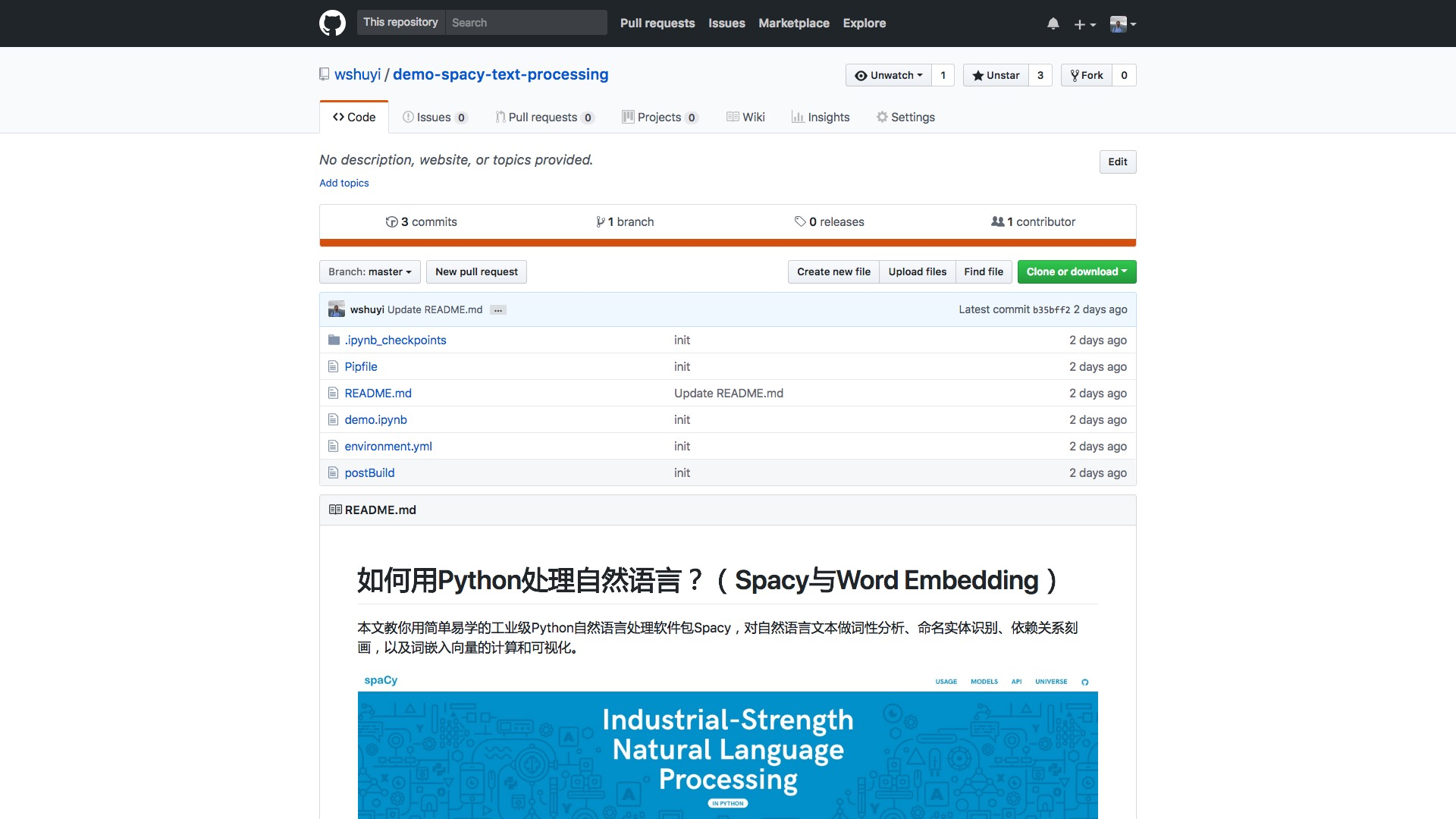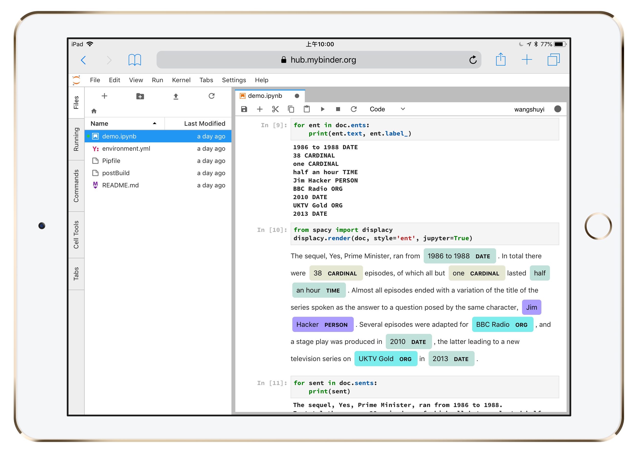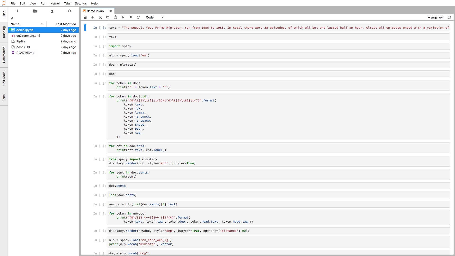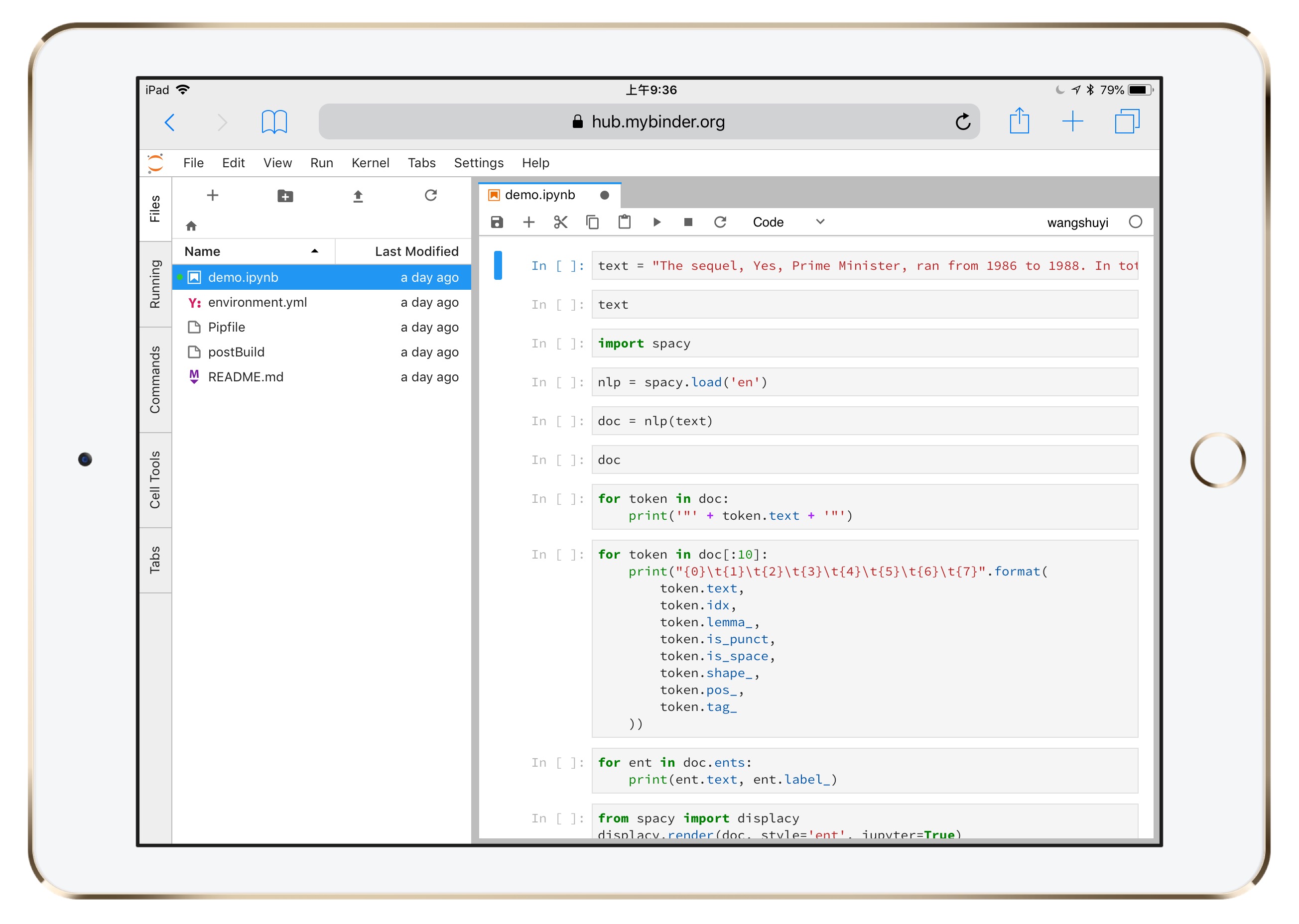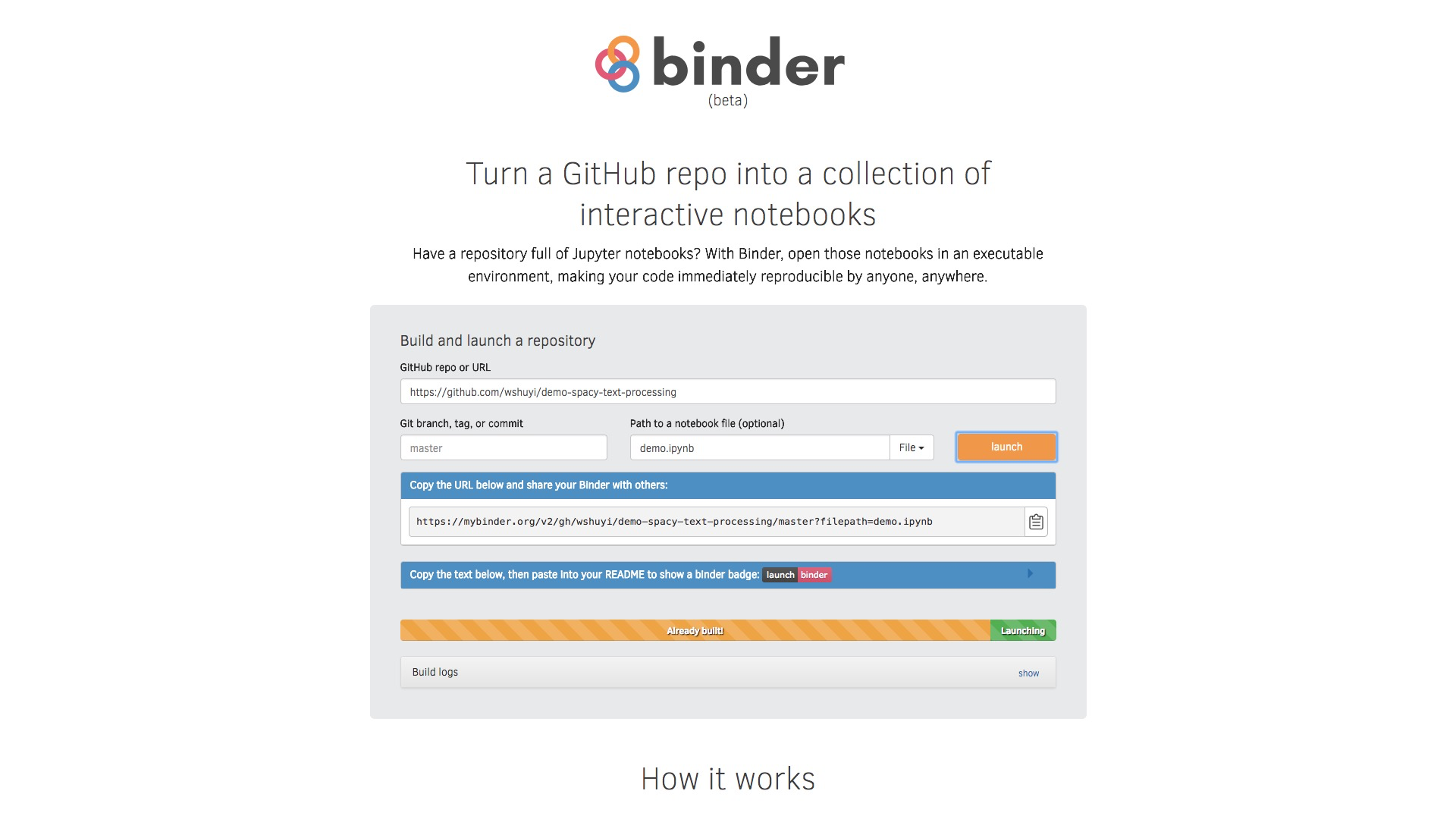 https://mybinder.org/v2/gh/wshuyi/demo-spacy-text-processing/master?urlpath=lab/tree/demo.ipynb