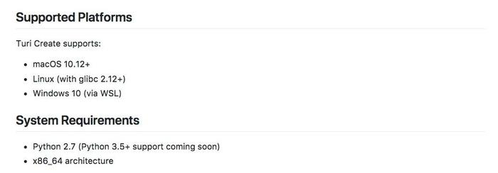 我在《如何用Python和深度神经网络寻找近似图片?》(7.3)一文中,对这个疑问做了回应——TuriCreate目前支持的操作系统有限,只包括如下选项: